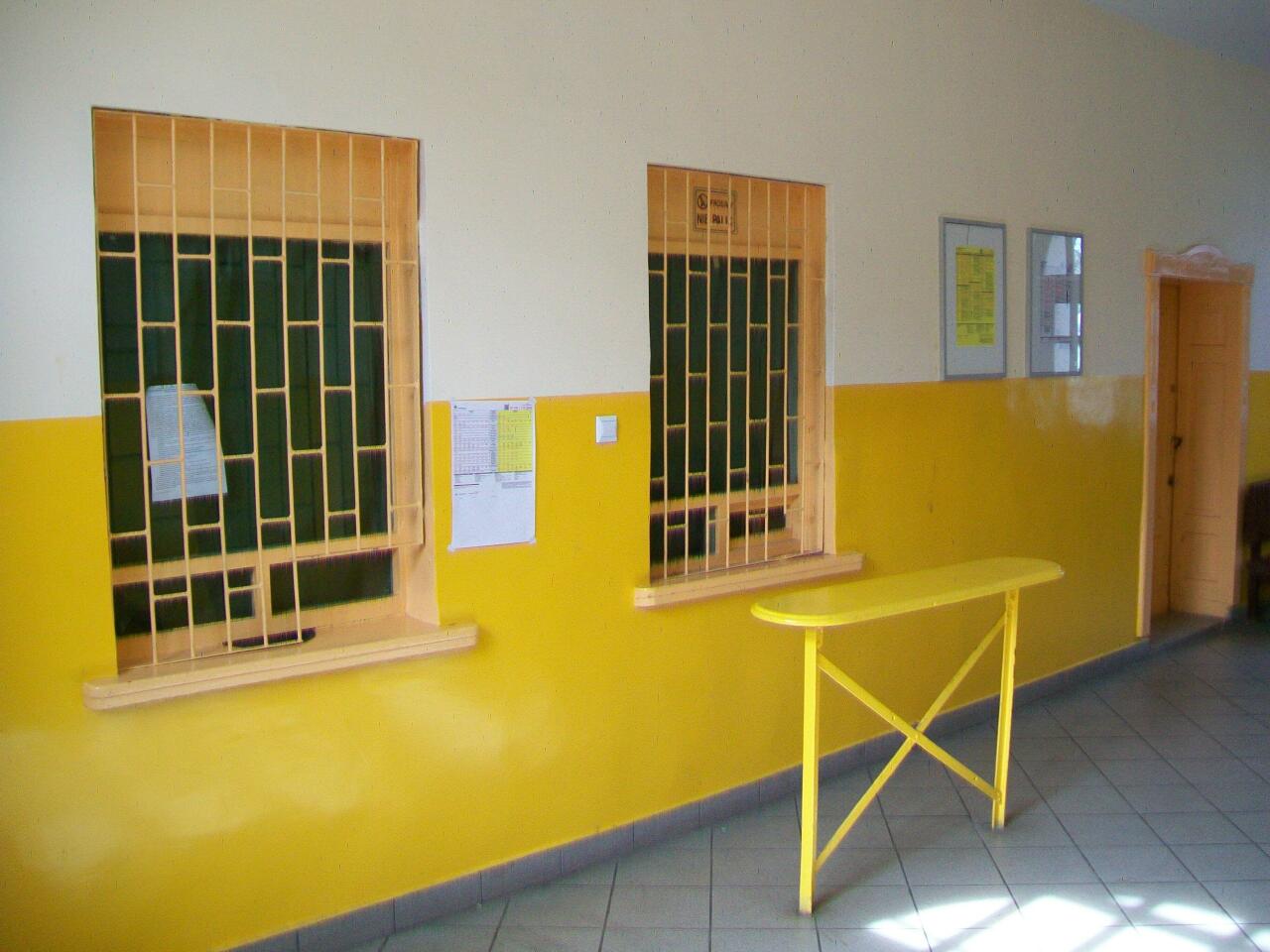 Zamknięte okienka kasowe w wyremontowanej poczekalni.