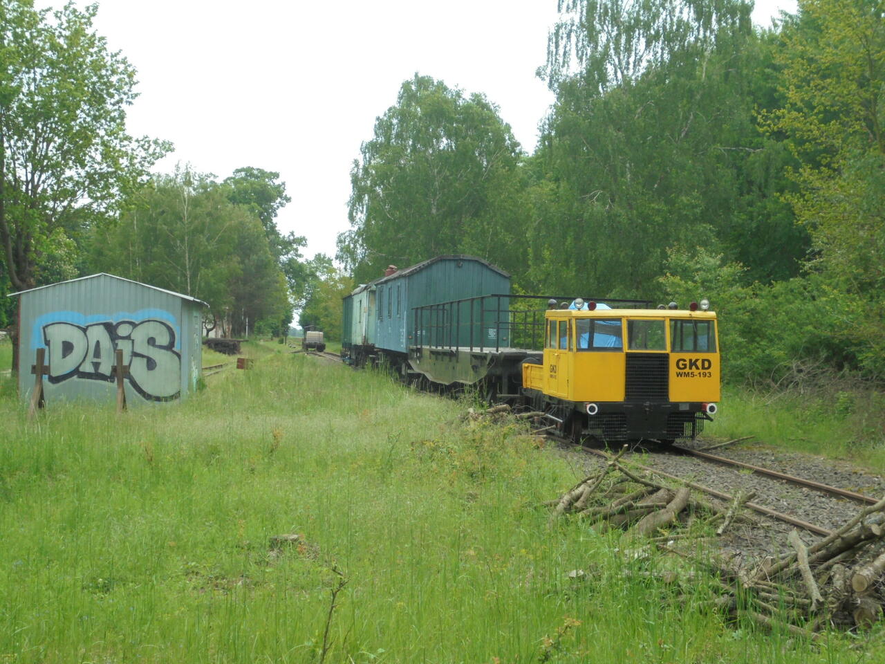 Tabor na dawnej stacji. Jakaś platforma a dalej "lokomotywa"(?) maluchowa, dokładniej coś jak laweta na której stoi maluch i napęd tej lawety przekazywany jest z tylnich kół malucha na koła kolejowe (opony stoją miedzy dwoma wałkami podobnymi do tych na stacjach SKP). Dalej trzy wagony, platforma i wózek motorowy WM5. Po prawej blaszana szopa. Widok w stronę Grodziska Wlkp.
