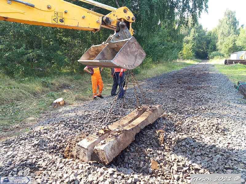 Demontaż fragmentu toru na stacji. Prace prowadzone w ramach przebudowy układu torowego. Widok w kierunku Grodziska Wielkopolskiego.