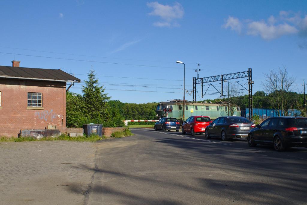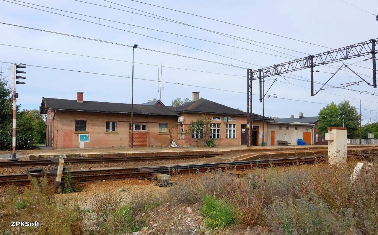 Widok z przejazdu kolejowego przez ul. Kolejowa w kierunku północnym, od strony wjazdu ze Strzelina. Z lewej budynek dworca z nastawnią.