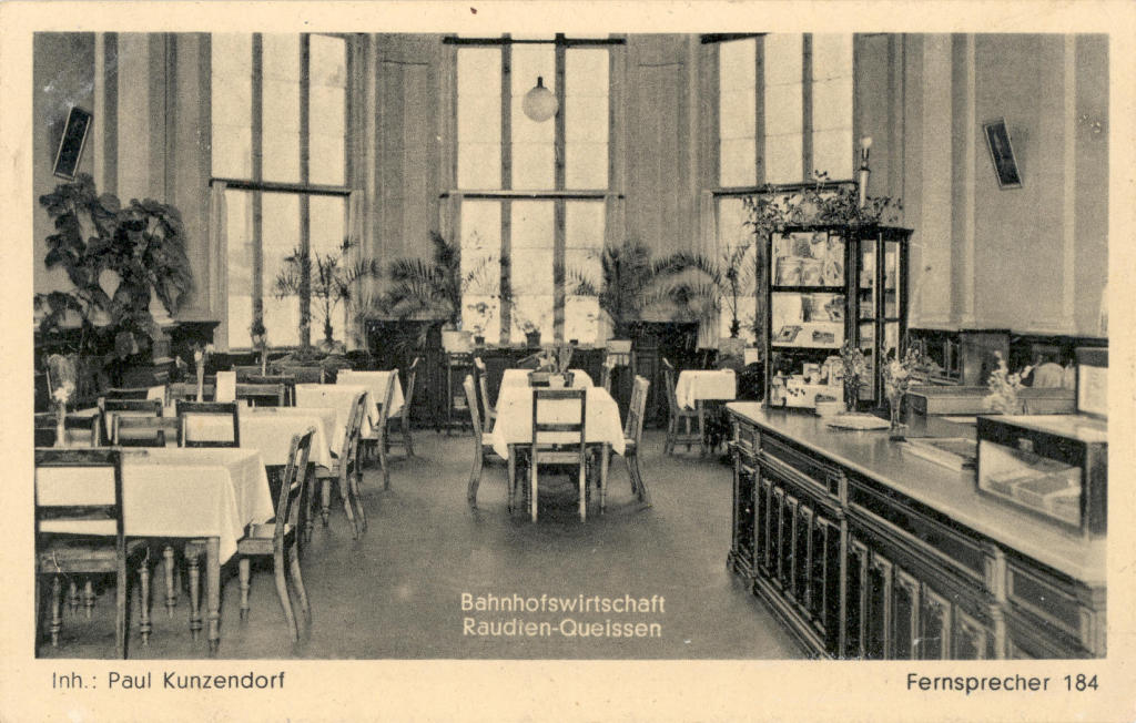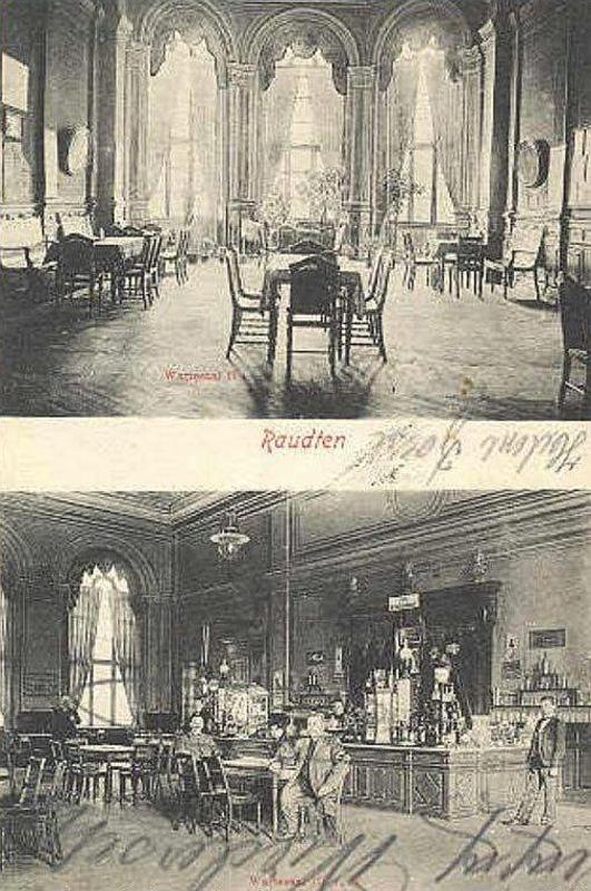 Raudten Huptbahnhof - wnętrze restauracji dworcowej - 1908 rok. Na dwuobrazkowej widokówce niemieckiej typu "Gruss aus Raudten".