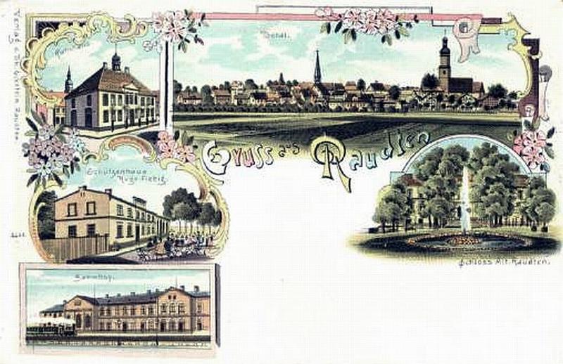 Raudten Bahnhof. Na starej wieloobrazkowej widokówce niemieckiej z 1901 typu "Gruss aus Raudten".