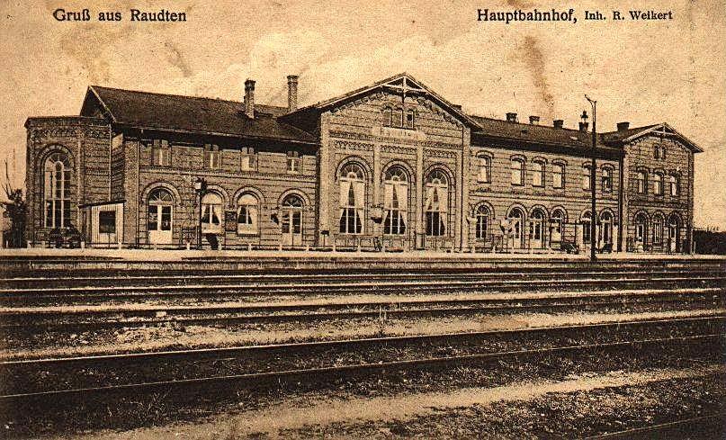 Raudten Huptbahnhof. Na widokówce niemieckiej typu "Gruss aus Raudten".