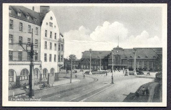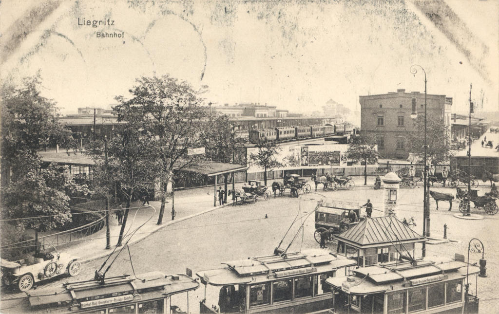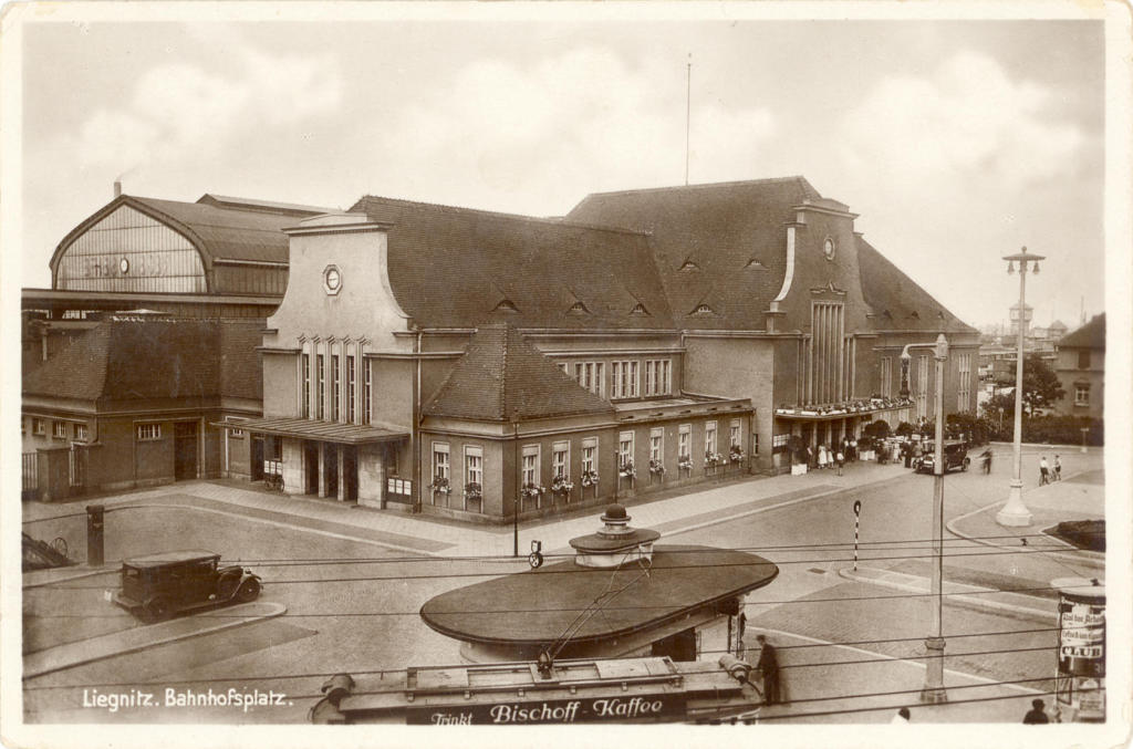 Budynek dworca od strony podjazdu, w kierunku północno-wschodnim. Z lewej wejście zachodnie, z prawej wejście główne. Ze zbiorów Adama Pacześniaka. U dołu widoczny fragment legnickiego tramwaju i tramwajowej sieci trakcyjnej.