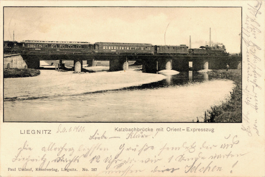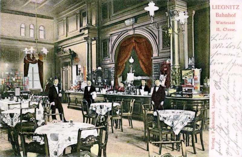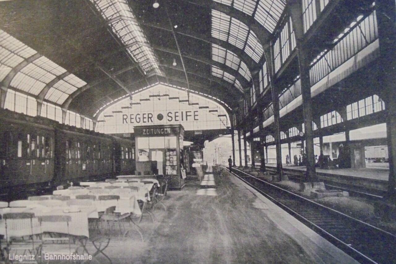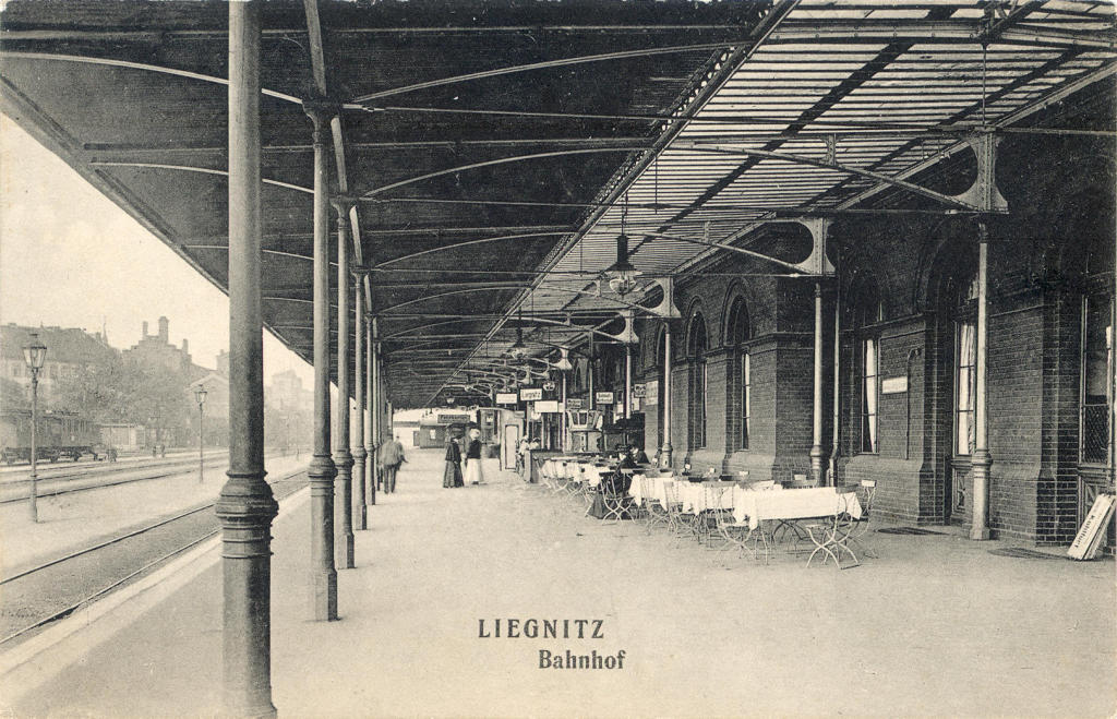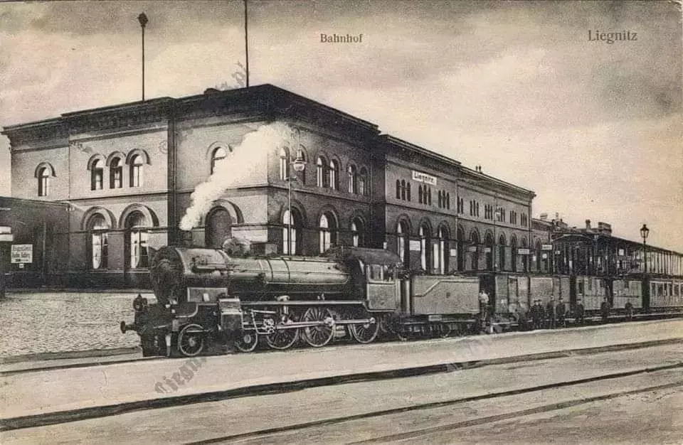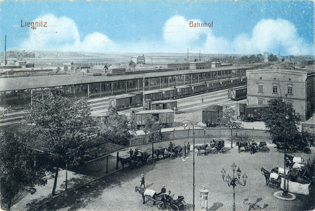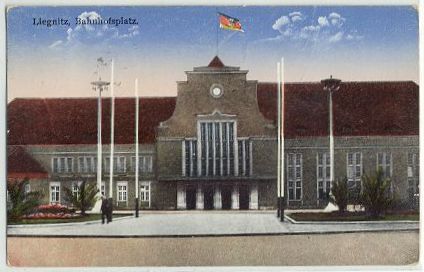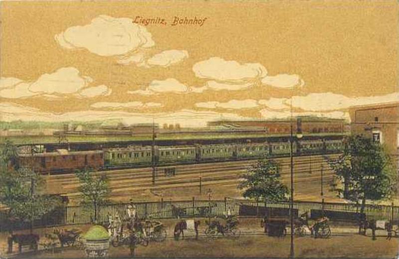 Dworzec w Legnicy na dawnej pocztówce. Skład wydaje się doklejony. Widok w kierunku południowo-zachodnim, od strony wjazdów z Malczyc/Wrocławia i Jawora.