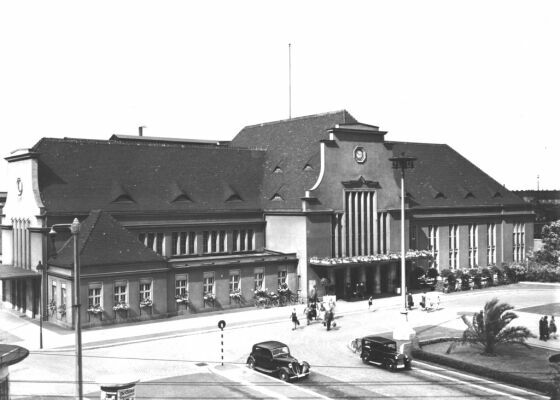 Dworzec w Legnicy, lata 30. XX wieku. W bruku ul. Dworcowej widoczne torowisko tramwajowe. Widok w kierunku północnym.
