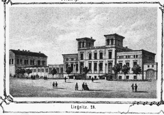 Stara pocztówka. Na dole kadru widoczny legnickie tramwaje. Ze zbiorów Adama Pacześniaka.