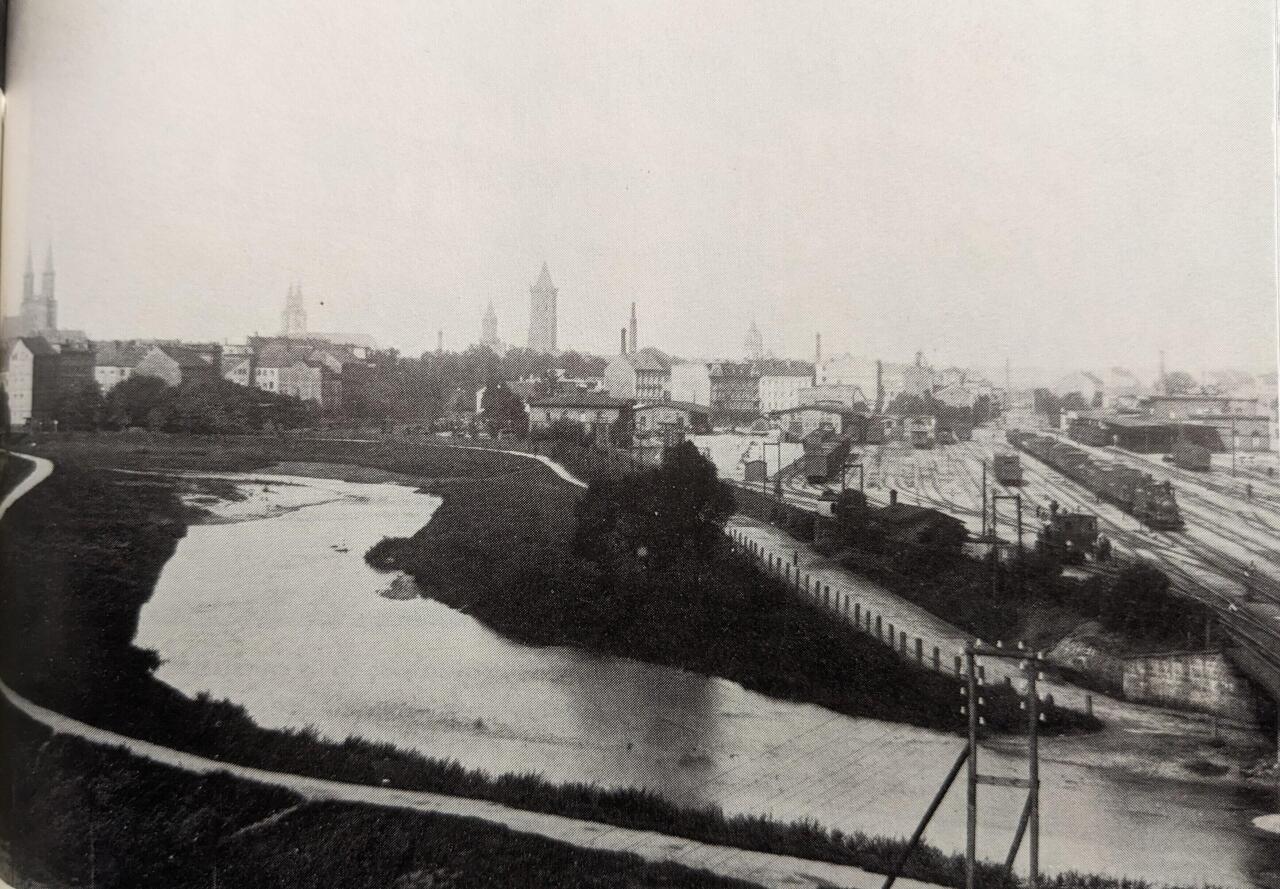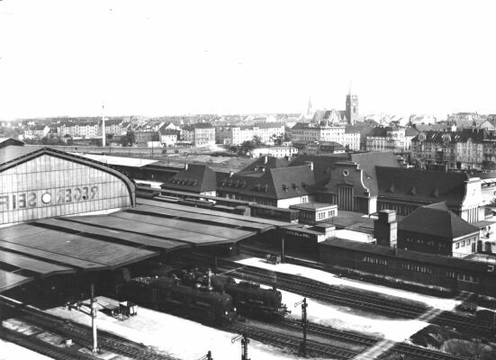 Ujęcie zrobione przed 1935, dokładna data nieznana. Widok na dworzec wyspowy od strony mostu nad Kaczawą (wjazdy z Malczyc/Wrocławia i Jawora). Na wprost znajdują się teraz rampy z magazynami oraz plac ładunkowy (obiekty obecnie rozbierane). Brak danych co do autora zdjęcia.