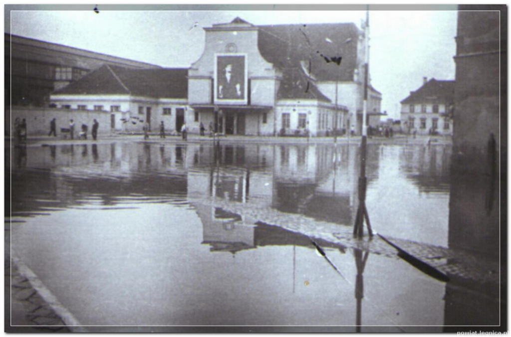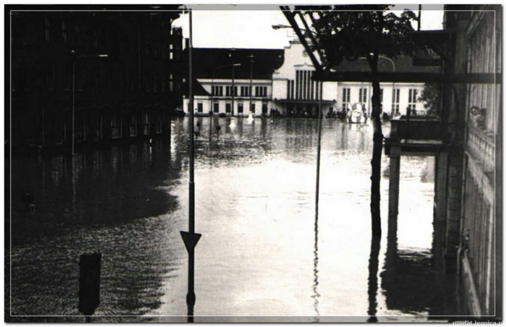 Legnica. Budynek dworca podczas powodzi w 1977 roku.