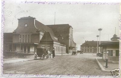 Dworzec w Legnicy na starej pocztówce. Widok w kierunku wschodnim od strony podjazdu.