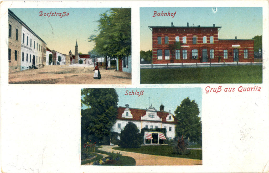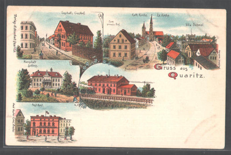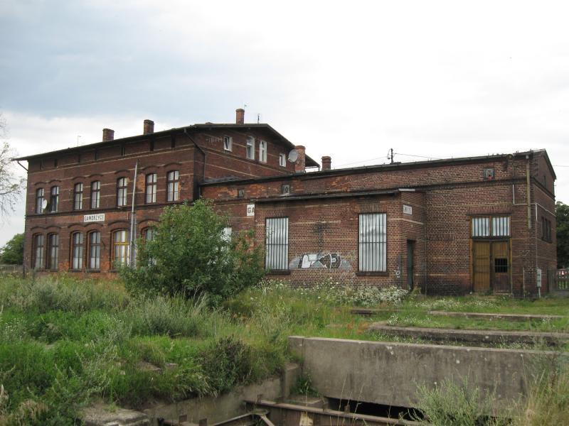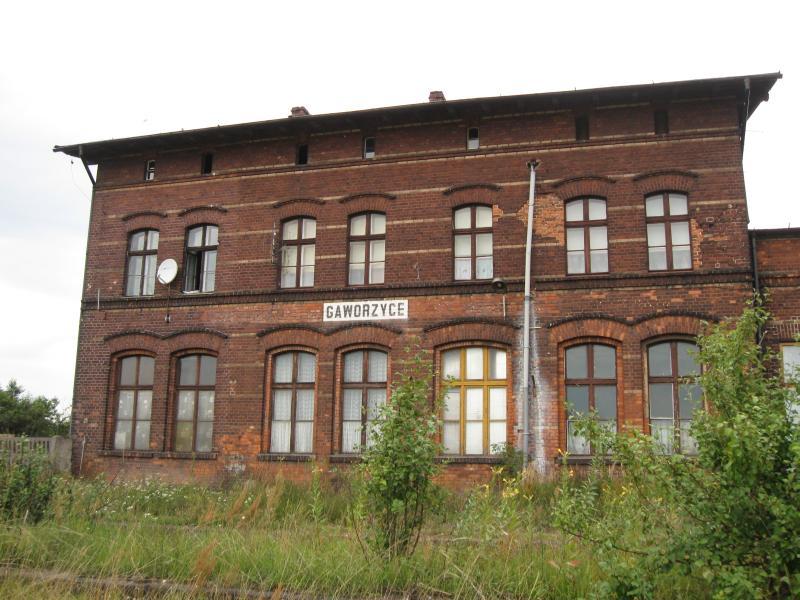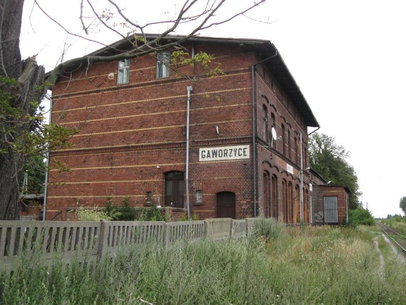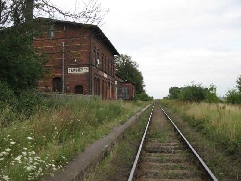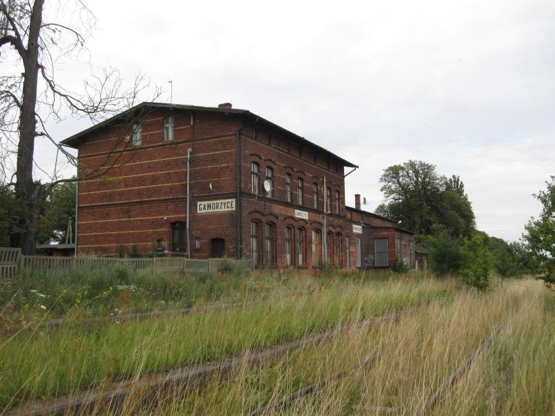 Gaworzyce (Quaritz). Widok na budynek dworca od strony peronów, w kierunku północnym; w lewo Niegosławice, w prawo Głogów.