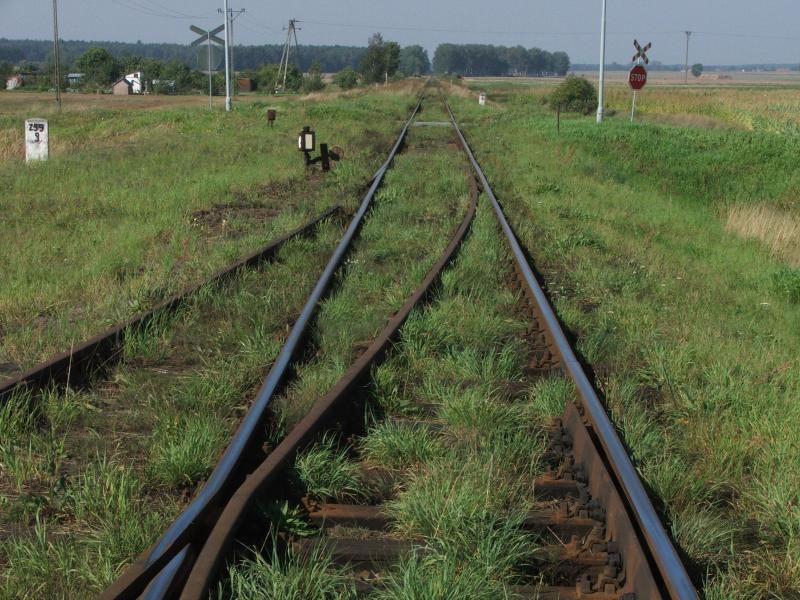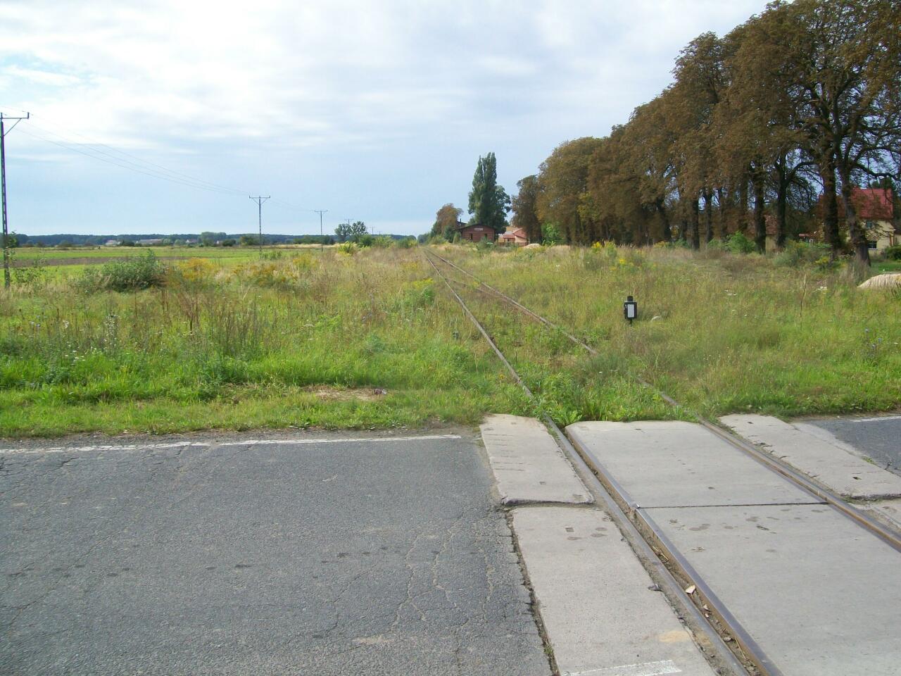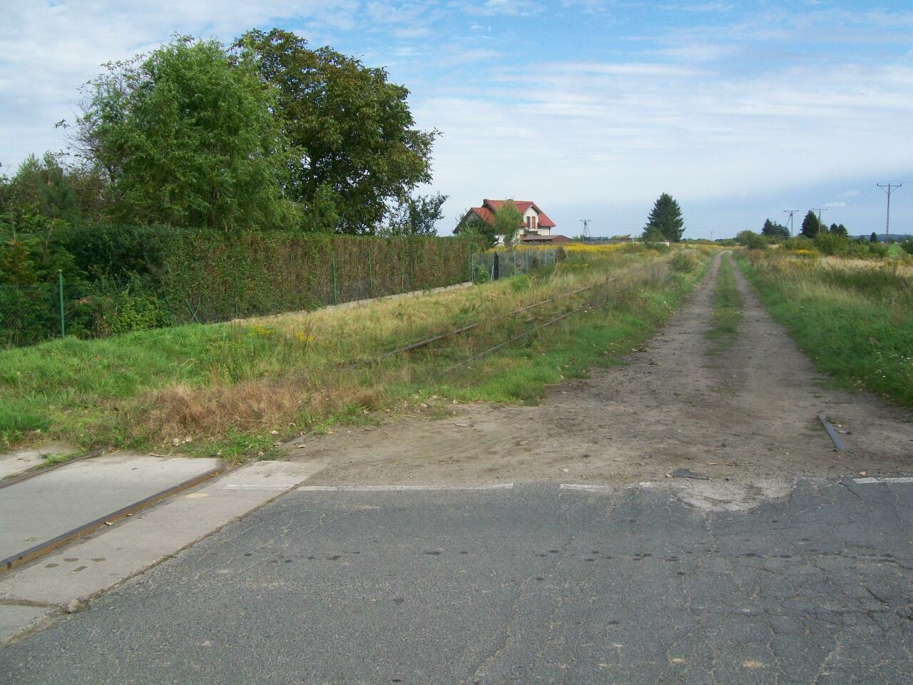 Widok z przejazdu kolejowego na drodze do Koźlic (w prawo) w kierunku wschodnim (Głogów).