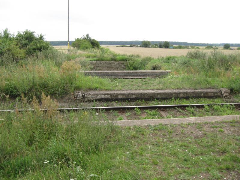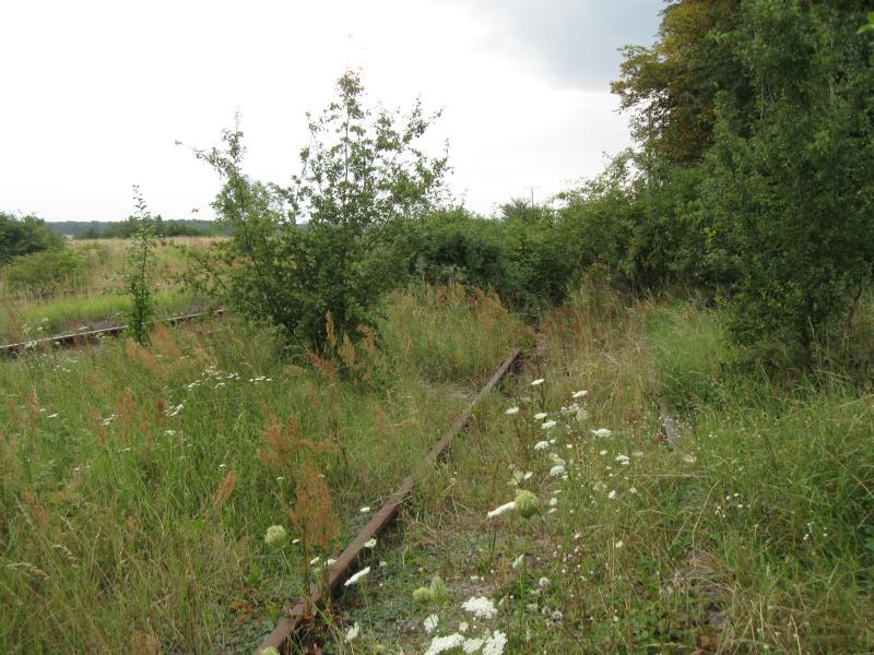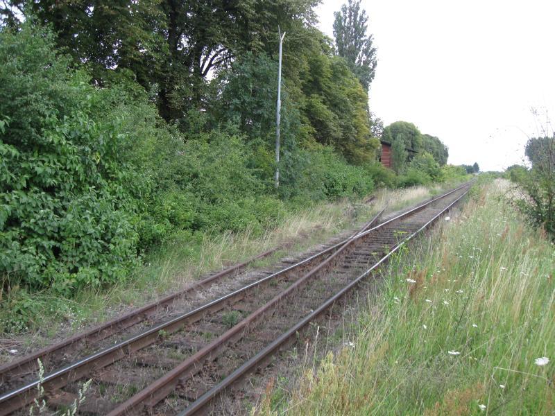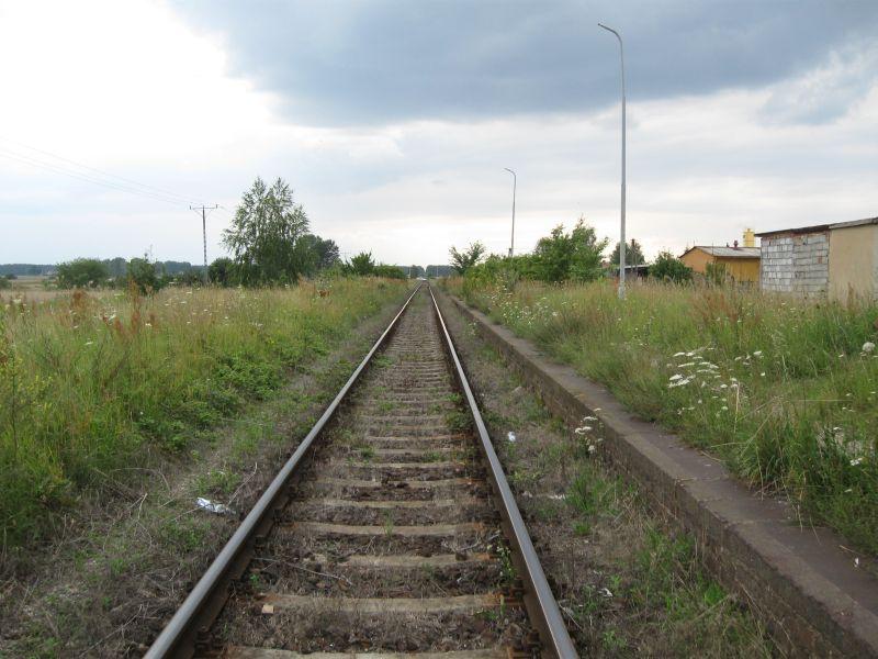 Zarośnięty tor od magazynu (za plecami). Widok w kierunku zachodnim (perony).