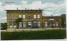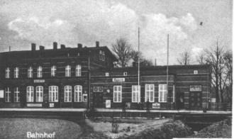 Ze zbiorów Adama Pacześniaka. W lewym, górnym rogu widok na budynek dworca od strony peronu oraz wagon silnikowy, stojący przy nim.
