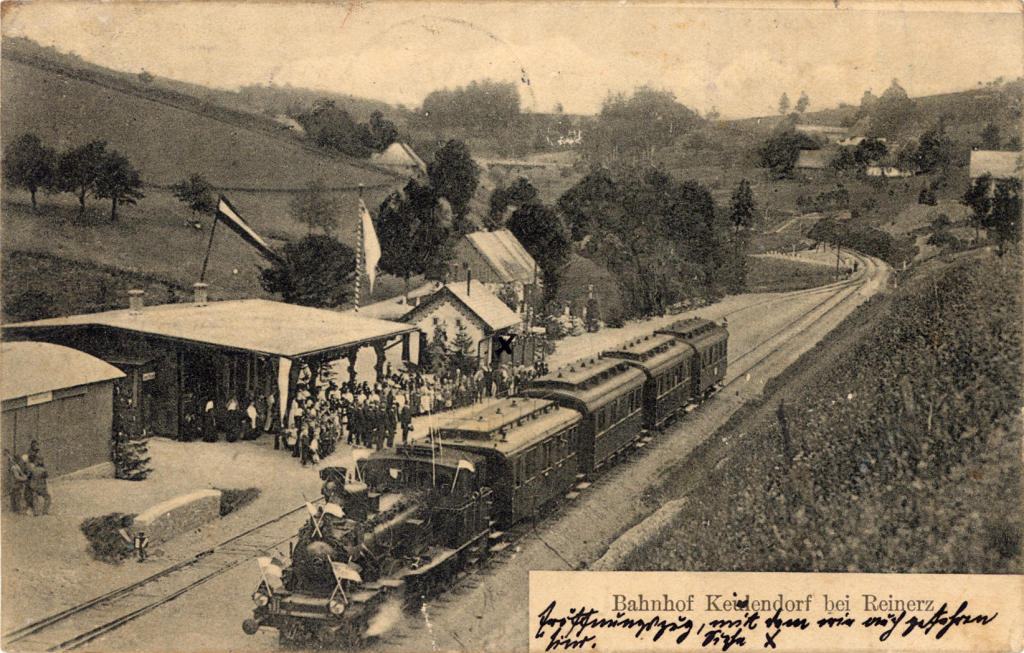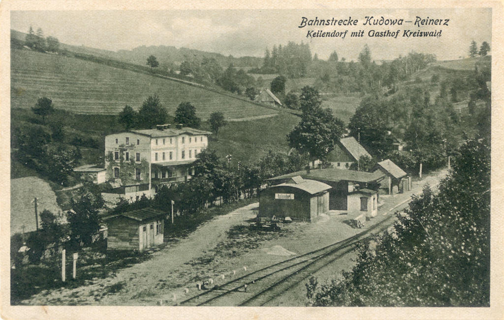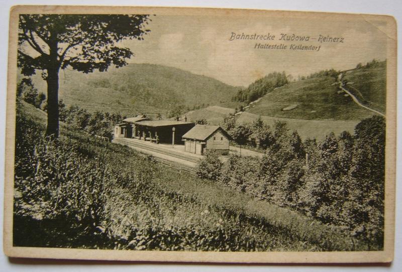Kulin Kłodzki na dawnej pocztówce. Widok na stację w kierunku wschodnim (Duszniki-Zdrój). Przed budynkiem dworca fragment nieistniejącego obecnie magazynu towarowego. Z tyłu okazały budynek mieszkalny nr 3, opuszczony i popadający w ruinę od wielu lat.