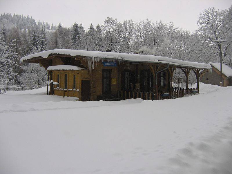 Widok ogólny na przystanek Kulin Kłodzki. Przykryty śniegiem tor prowadzi w stronę Kudowy-Zdrój (zachód).