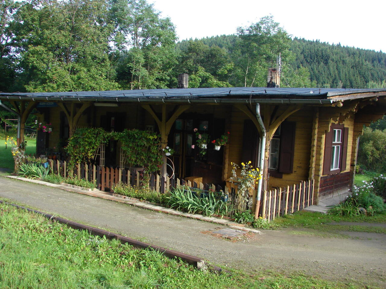 Opuszczony budynek mieszkalny położony w zachodniej głowicy dawnej stacji. Widok od strony toru w kierunku północno-zachodnim; w prawo peron i budynek dworca, w lewo Kudowa-Zdrój.