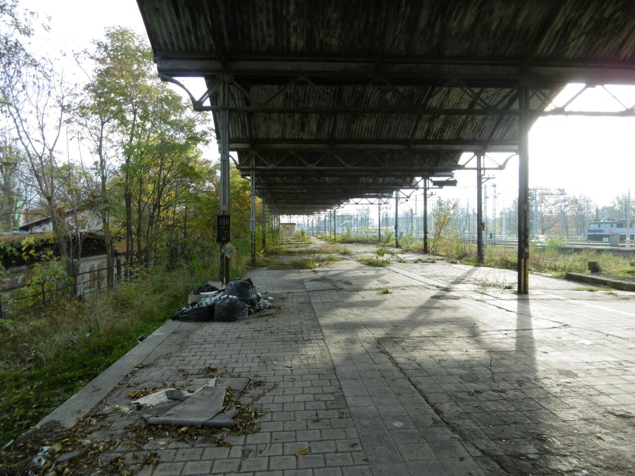Zarastający peron pocztowy. Widok w kierunku wschodnim. Z lewej strony fragment Dworca Górnośląskiego, wzdłuż którego także idzie tor.
