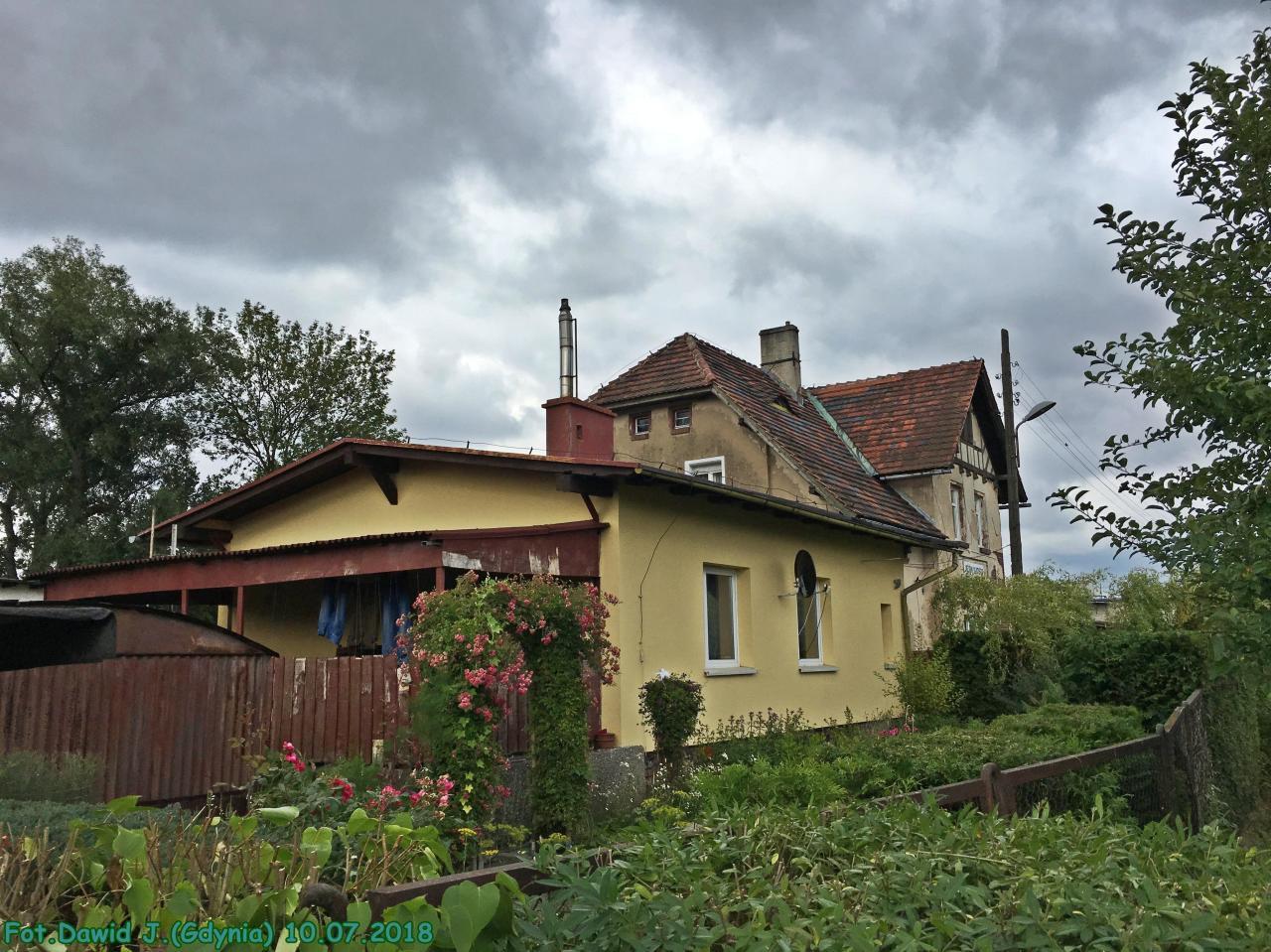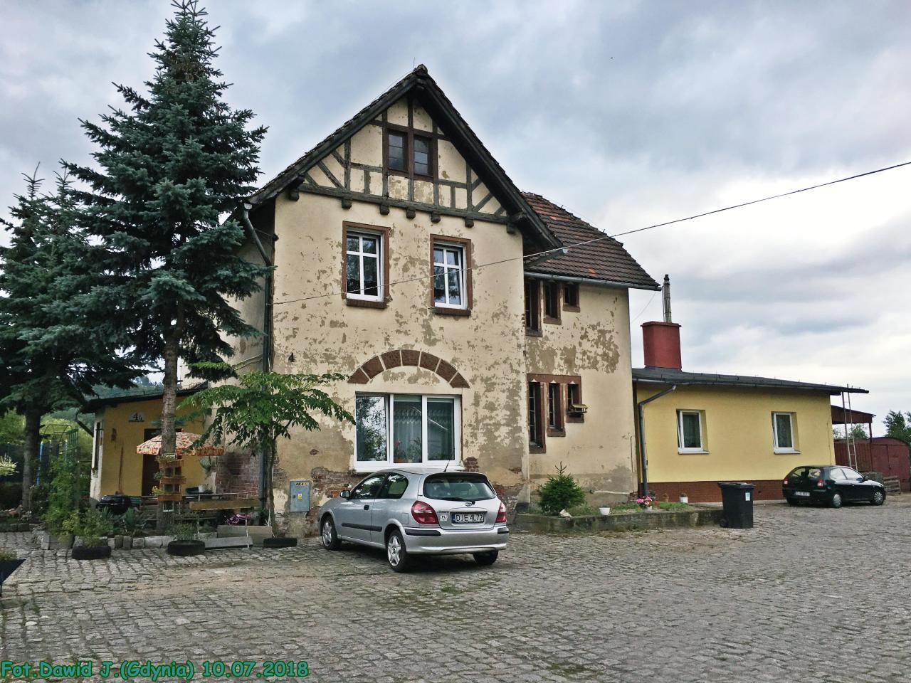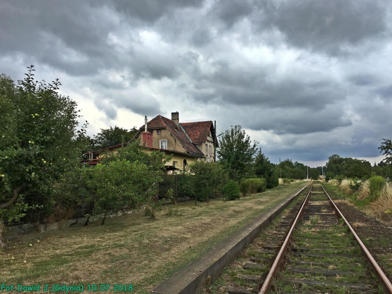 Widok w kierunku Jeleniej Góry. Budynek dworcowy po lewej stronie. Obiekt zamieszkały.