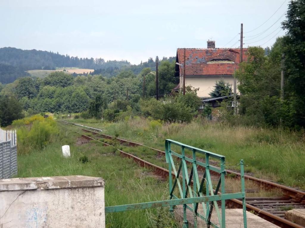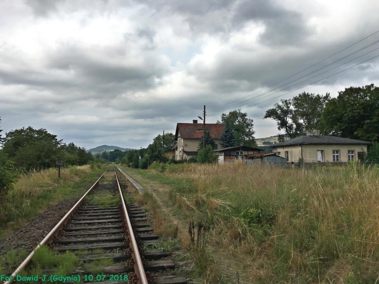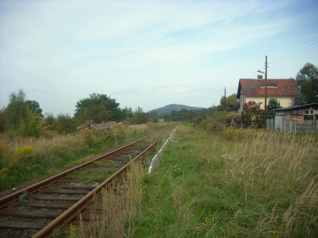 Widok w kierunku Lwówka Śląskiego/Żagania. W tle zamieszkały budynek dworca.