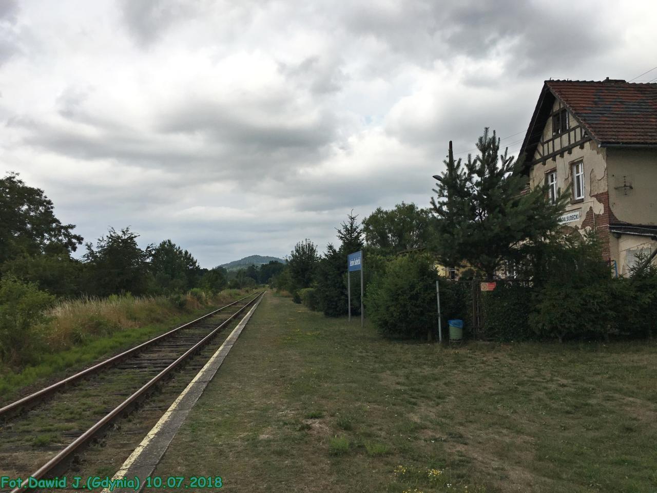 Widok z peronu w kierunku Lwówka Śląskiego/Żagania. Zamieszkany budynek dworcowa znajduje się po prawej stronie. Na peronie znajdują się zachowane detale: tablica z nazwą stacji, kosz, słupki po tablicach z informacjami od spółki Koleje Dolnośląskie, tabliczka informująca o zakazie palenia.