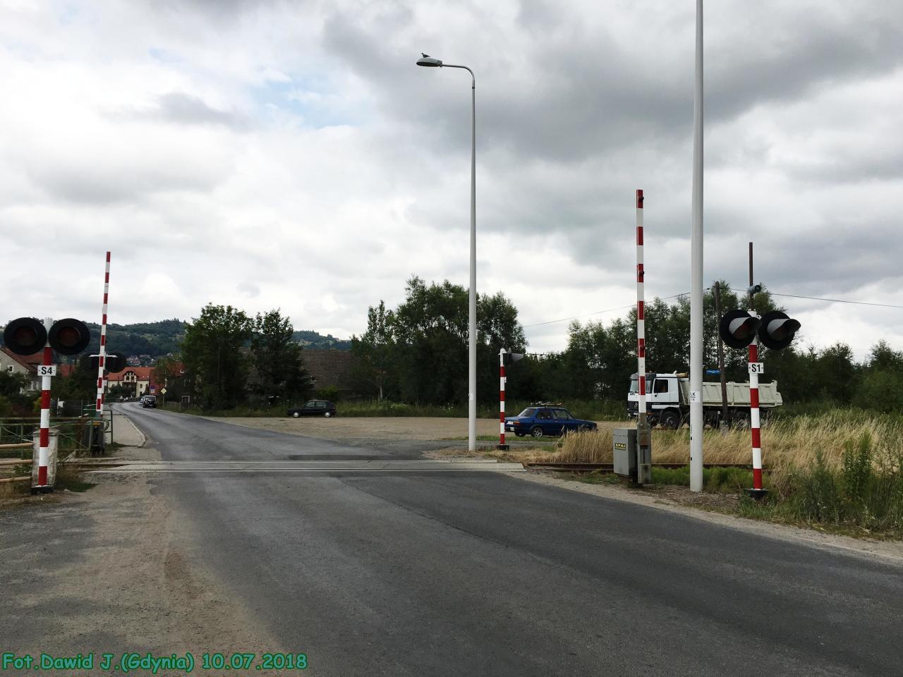 Jeżów Sudecki - widok w kierunku Jeleniej Góry. W przejazd drogowy, zamykane automatycznie. Z lewej zamieszkany budynek dworca.