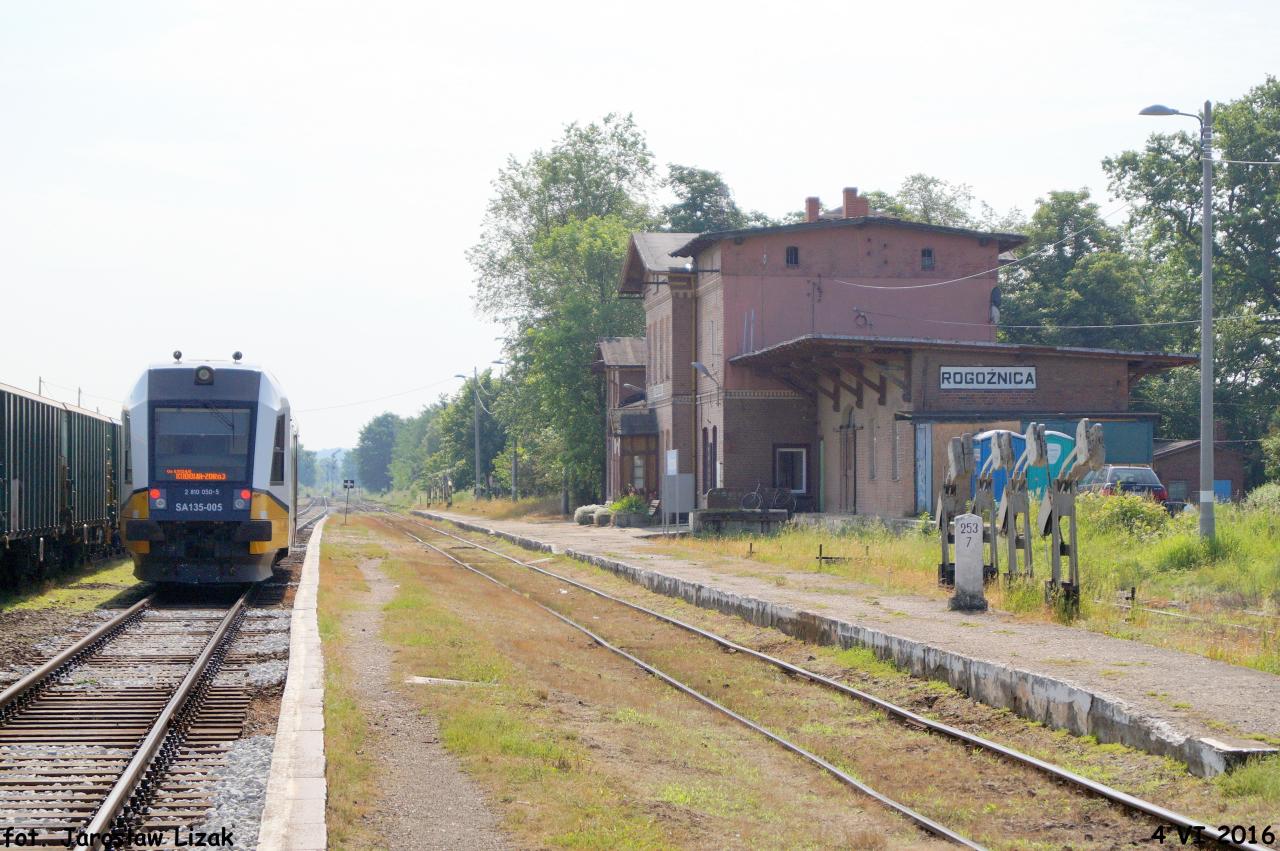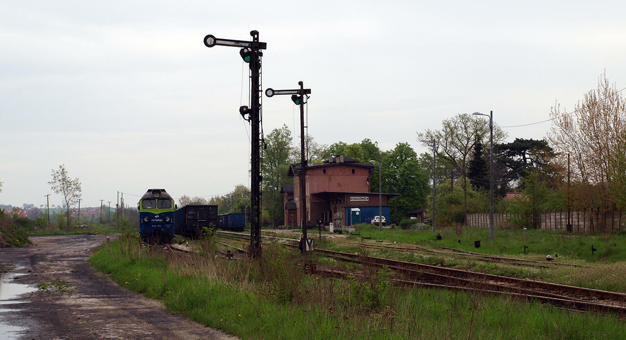 Magazyn towarowy i budynek dworca, w którym mieści się nastawnia dysponująca. Widok od strony peronów i wjazdu z Jawora/Legnicy. Ciekawie zachowana stacyjka na linii podsudeckiej, na której prowadzony jest spory ruch towarowy, a to ze względu bocznic do bazy nawierzchniowej DOLKOMu i fabryki podkładów strunobetonowych, zlokalizowane tuż przy stacji. Rozpoczynają się tu także dwie dłuższe bocznice: do Wrocławskiej Kopalni Surowców Mineralnych i drugiej ładowni kruszywa, po zachodniej stronie stacji. Historycznie ta stacja w latach 1940-45 była ostatnią dla 100 tysięcy więźniów, którzy byli przywożeni tu do obozu koncentracyjnego "Gross Rosen". Na zdjęciu pociąg osobowy Kolei Dolnośląskich z Międzylesia do Legnicy.