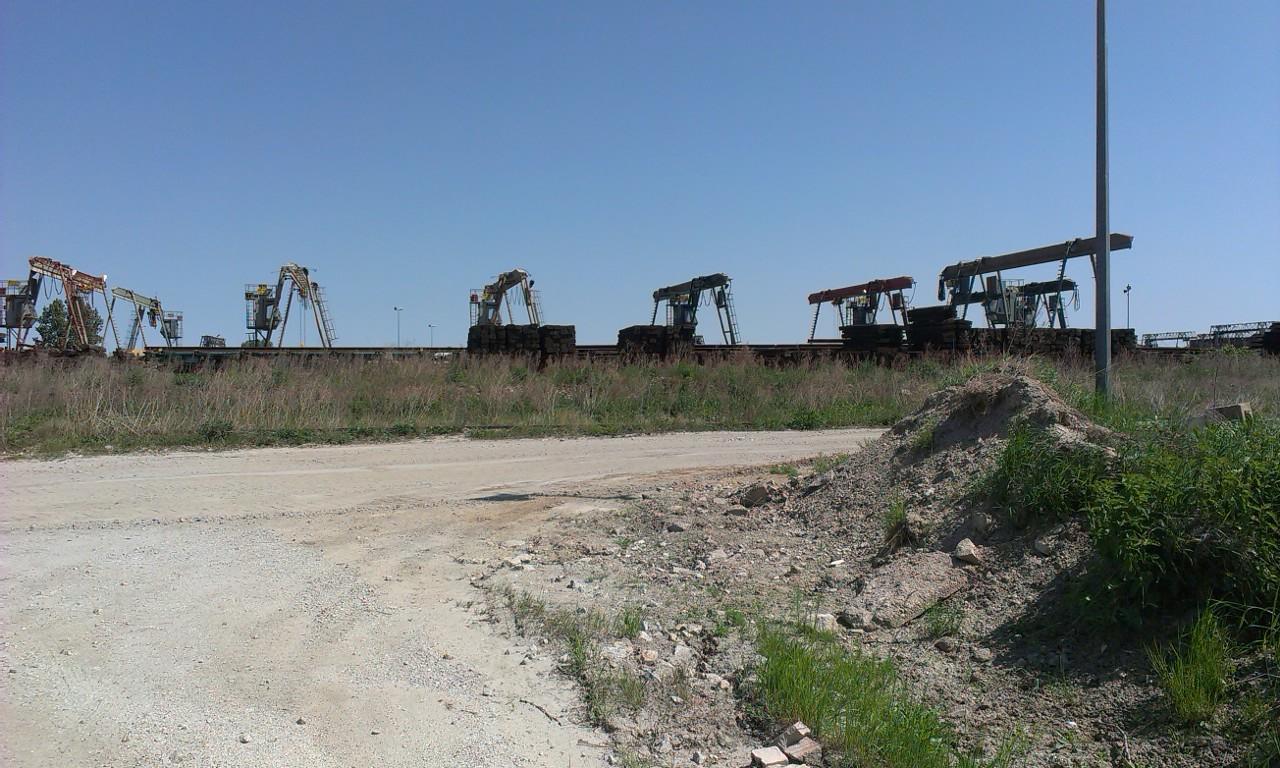Widok na suwnice bramowe na terenie bazy nawierzchniowej i sekcji napraw infrastruktury nr 4 w Goczałkowie, należących do spółki DOLKOM z Wrocławia. Widoczne urządzenia mają po ok 40 lat. W lewo dworzec i perony, w prawo Strzegom.