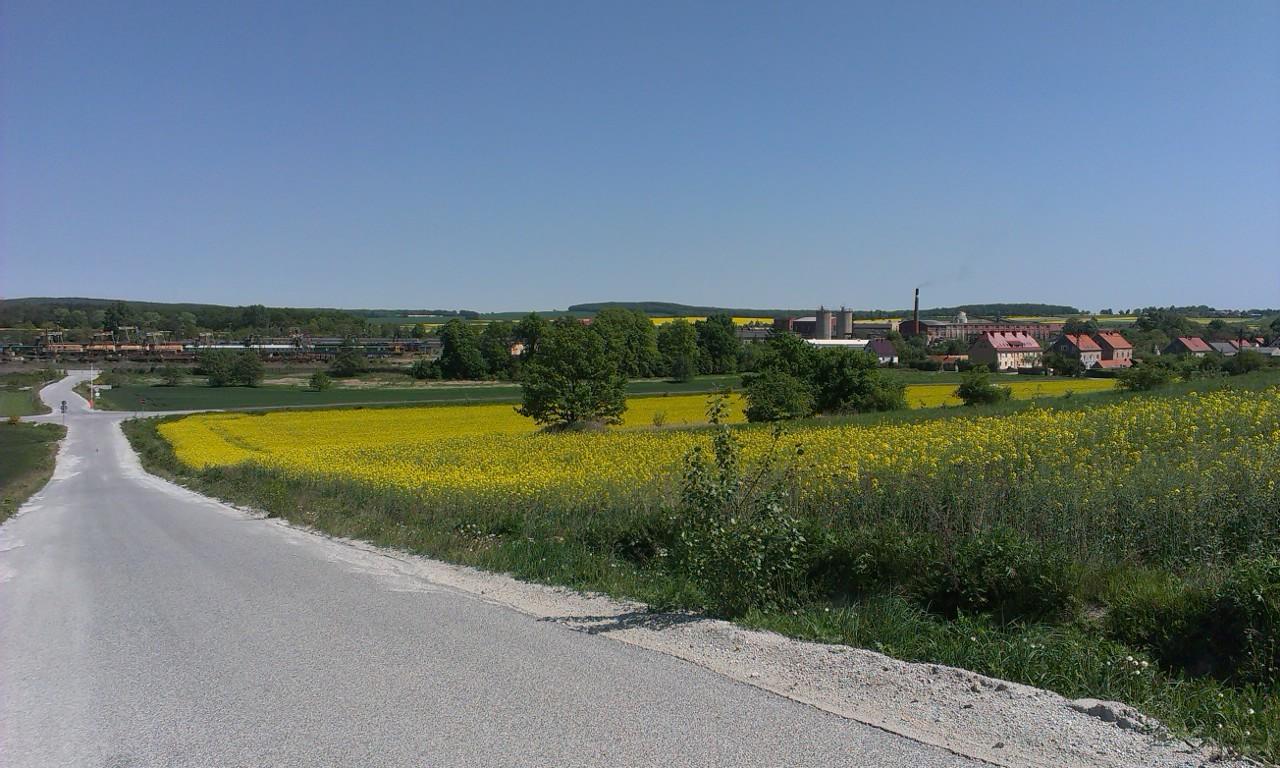 Widok ze wzgórza na bazę nawierzchniową DOLKOM'u (po lewej) i budynki Wytwórni Podkładów Strunbetonowych "TrackTec". W lewo dworzec i perony, w prawo Strzegom.