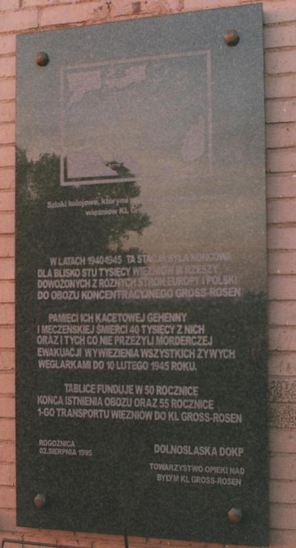 Tablica pamiątkowa na stacji, ufundowana w 55. rocznicę I transportu więźniów do KL Gross-Rosen (patrz: linia Rogoźnica-obóz… w "Danych podstawowych").