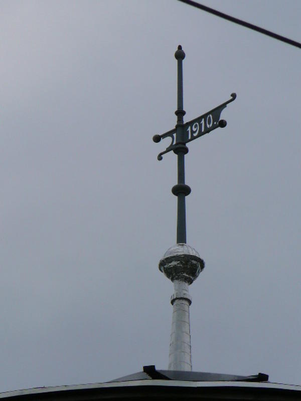 Bojanowo. Chorągiewka na szczycie wieży wodnej z rokiem budowy wieży.