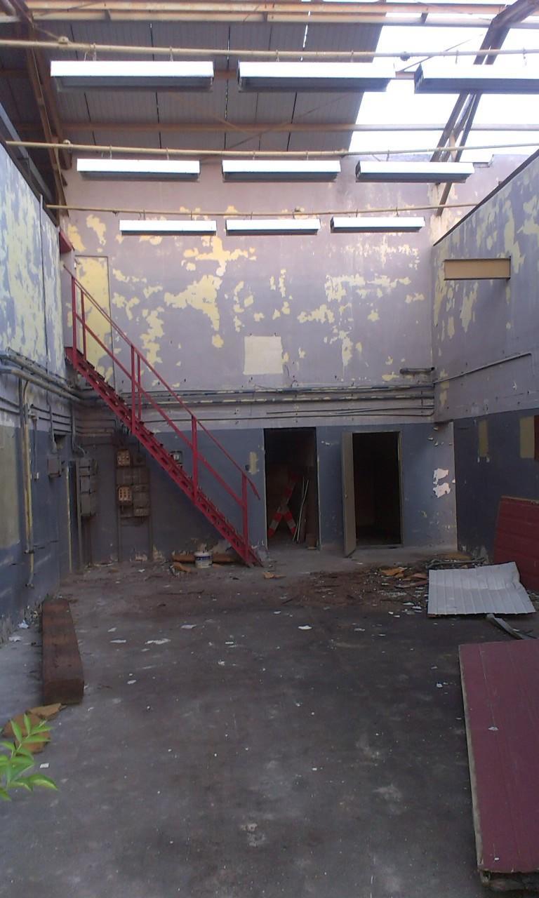 Widok na rozbierany budynek dawnej lokomotywowni.