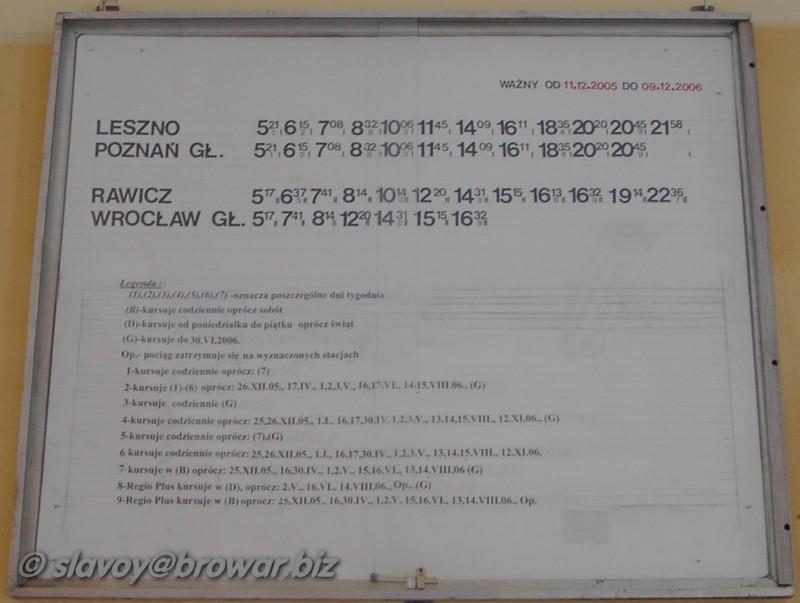 Budynek dworcowy widoczny od strony torów. W lewo Leszno, Poznań Główny, Góra Śląska, Głogów w prawo Rawicz, Wrocław Główny.