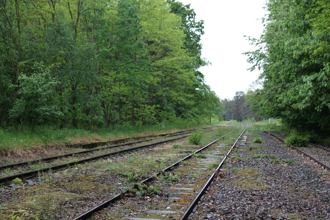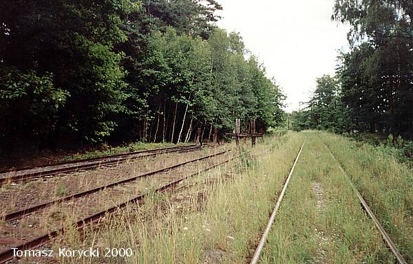 Widok od strony Chocianowa na stację Duninów. Widać rozjazd, a po lewej tor wiodący od bramy poligonu wojskowego.