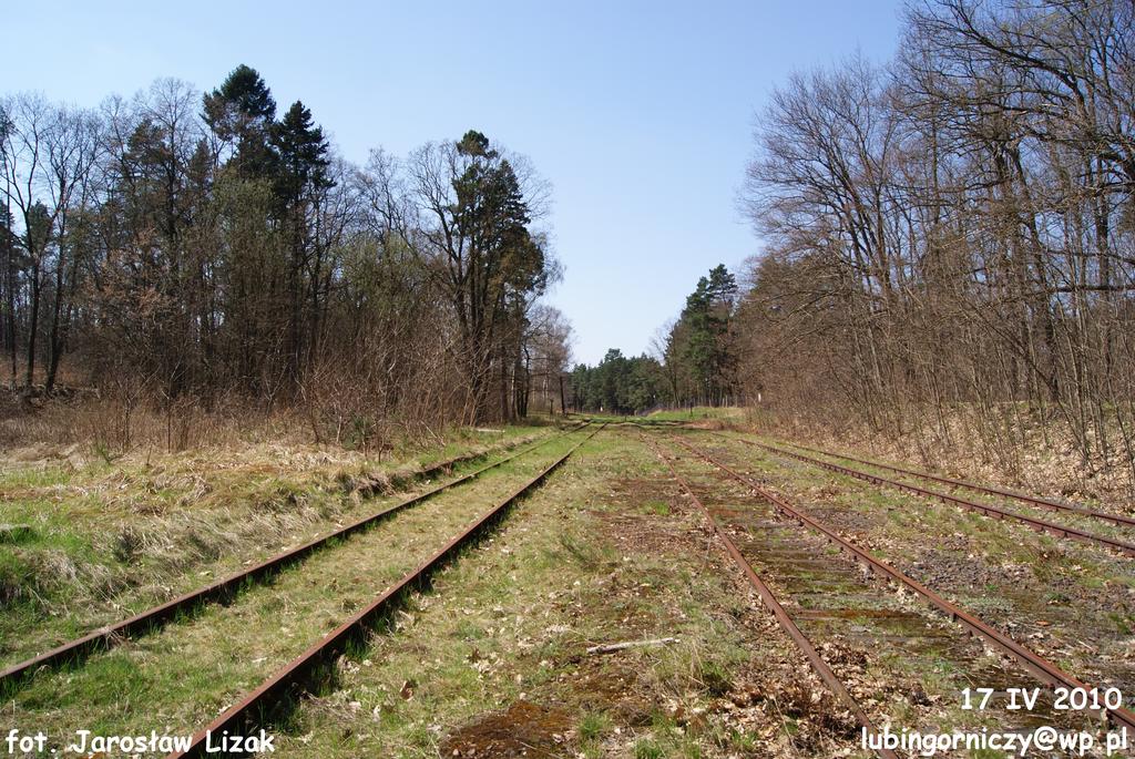 Wjazd na teren dawnej stacji od Rokitek. Po lewej tor z bocznicy wojska. Widok w kierunku Chocianowa.