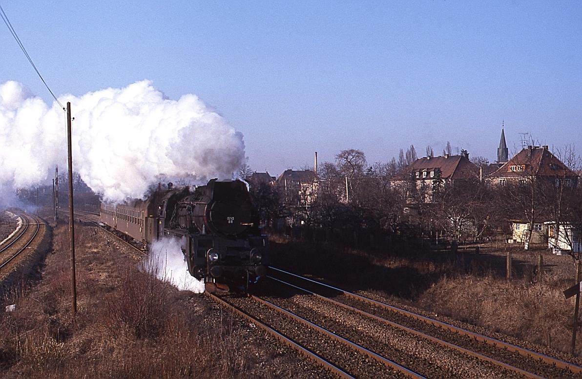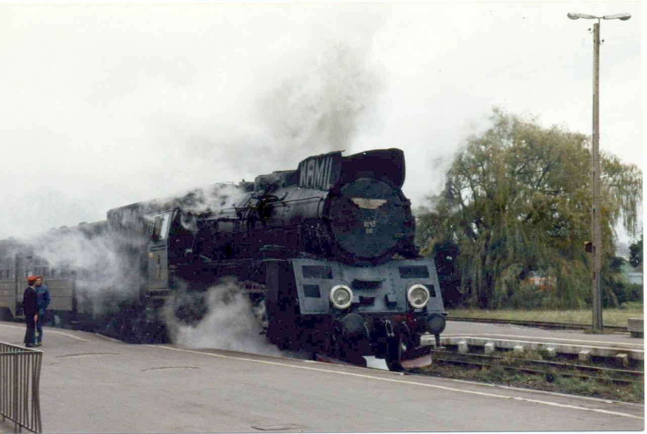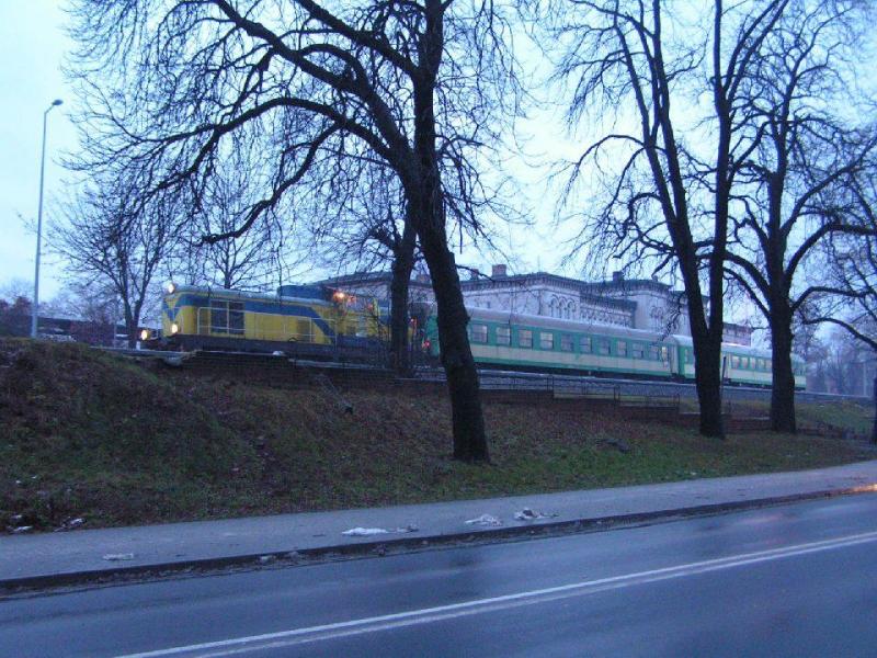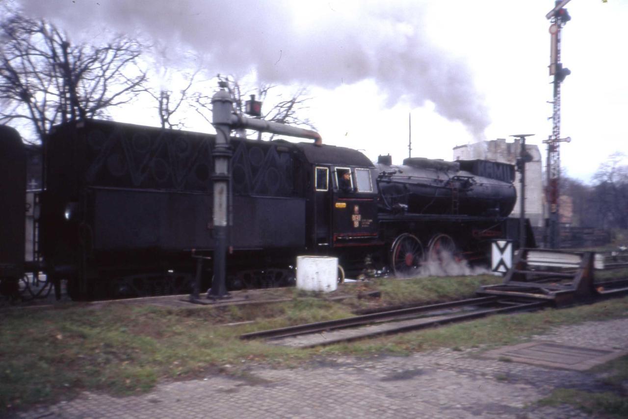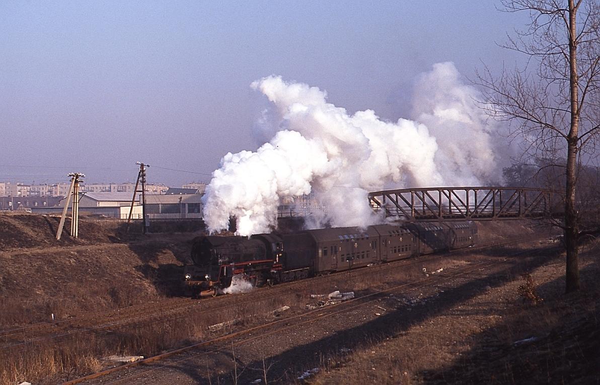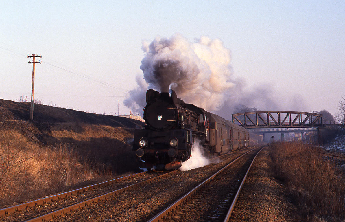 Pociąg wyjeżdżający z Żar w kierunku Żagania. Tor pierwszy z lewej, pojawiający się w kadrze łagodnym łukiem, to wjazd z Węglińca. Na drugim planie widoczny semafor wjazdowy z tego kierunku, ukryty nieco w dymie z parowozu. W centrum kadru widoczne dwa tory linii Łódź Kaliska - Tuplice. Widok w kierunku zachodnim, zdjęcie zrobione w okolicy przejazdu kolejowego na ul. Wojska Polskiego. Jeżeli fotka była zrobiona wczesną wiosną roku 1991 to bardzo prawdopodobne, że mamy do czynienia ze składem Lubsko - Żagań przez Lipsk Żarski i Żary; gdzieś w pamięci pozostały mi składy tej relacji zestawione z Ol49 i dwóch wagonów klasy 2.