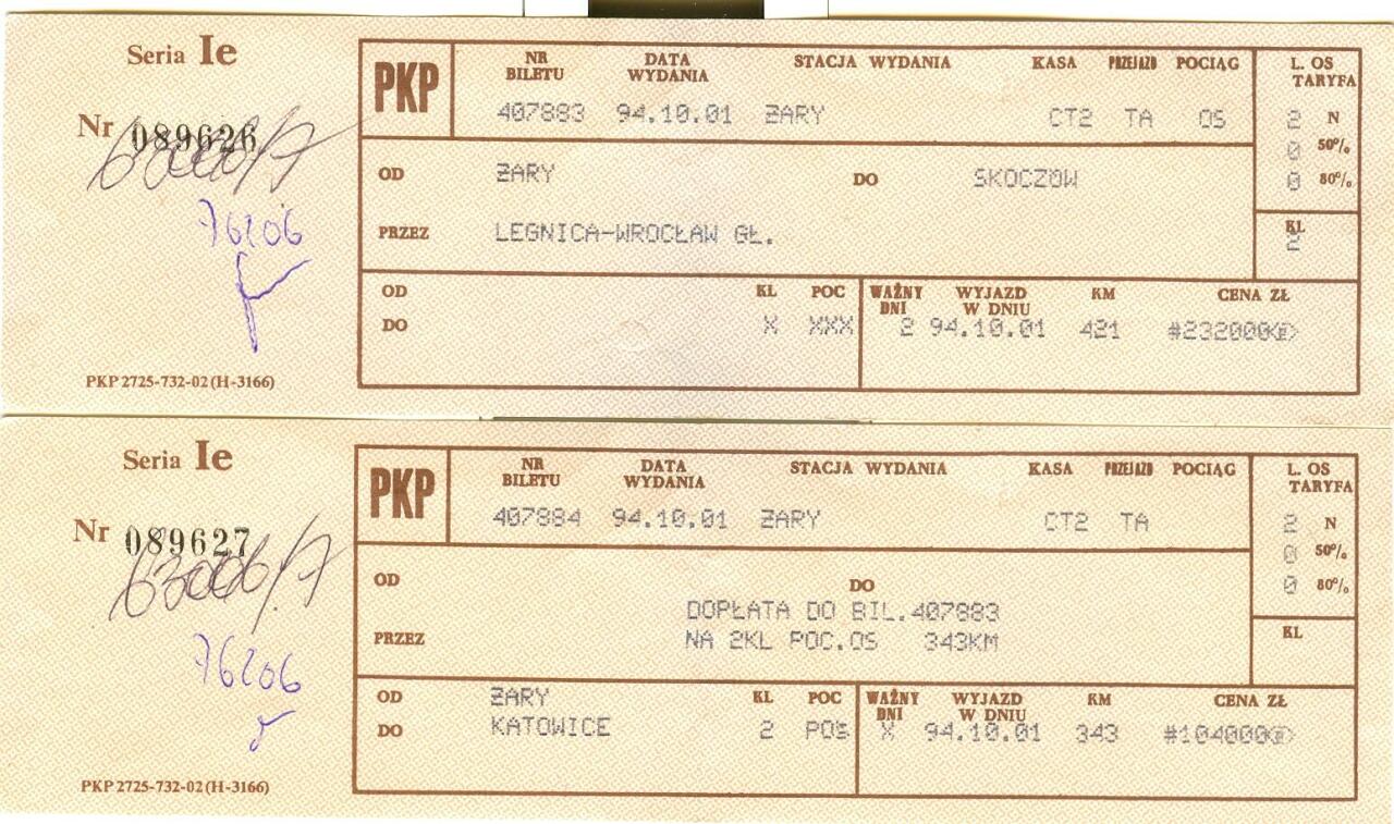 Bilety kolejowe wydane na st. Żary na przejazd w rel. Żary-Skoczów, w dn. 1.10.1994 r.