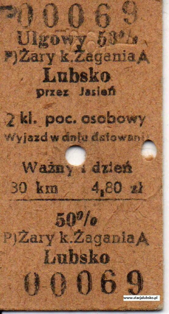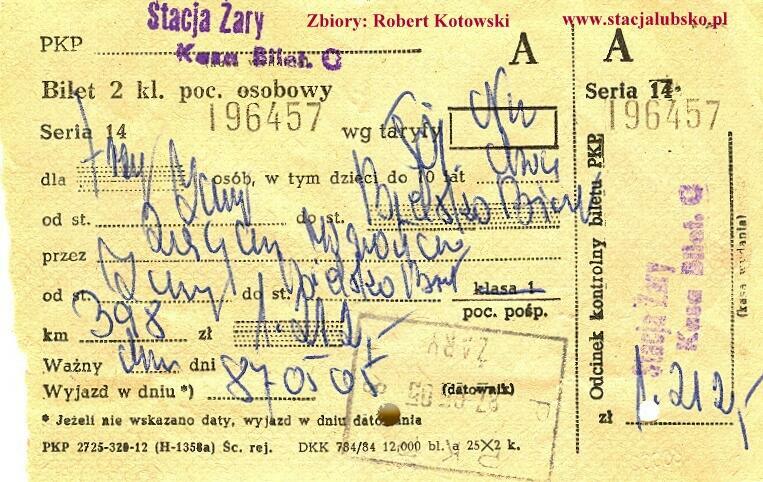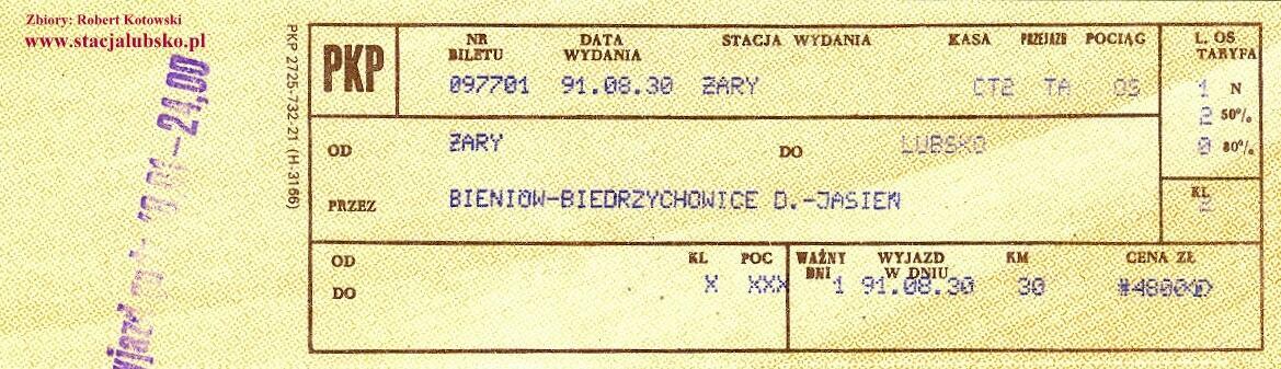 Bilet wydany na st. Żary w rel. Żary-Lubsko p. Bieniów-Biedrzychowice-Jasień.