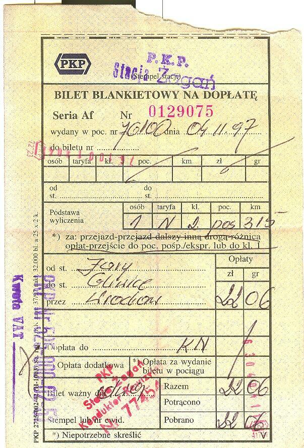 Bilet blankietowy wydany w pociągu nr 76100 na przejazd na trasie Żary-Gliwice.