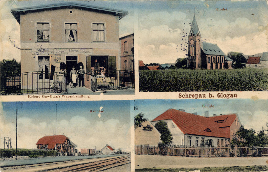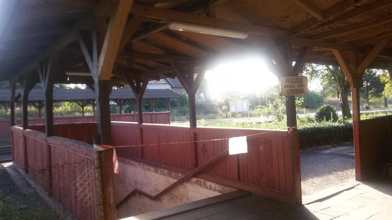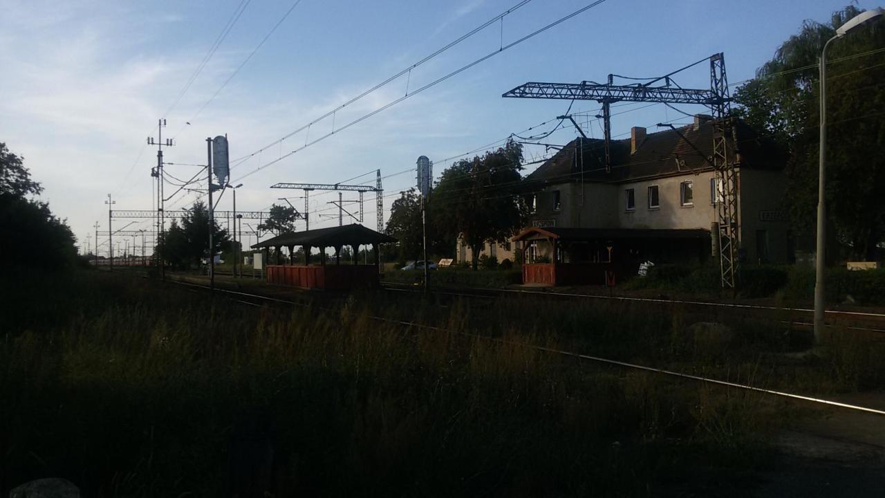 Budynek stacyjny - widok z peronu. Widok z pociągu nr 8646 relacji Kamień Pomorski – Wrocław Główny w kierunku Głogowa o godz. 18,53. Zadaszenie przejścia podziemnego przylegającego do budynku często mylnie uznawane jest za wiatę peronową.