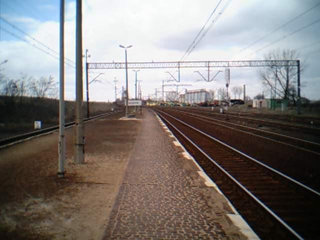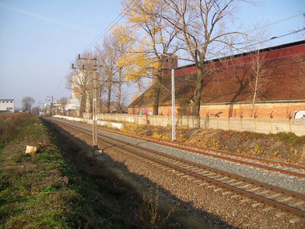 Widok z peronu w stronę Głogowa. W pobliżu bocznicy znajduje się Skład Opału i Skup Złomu.