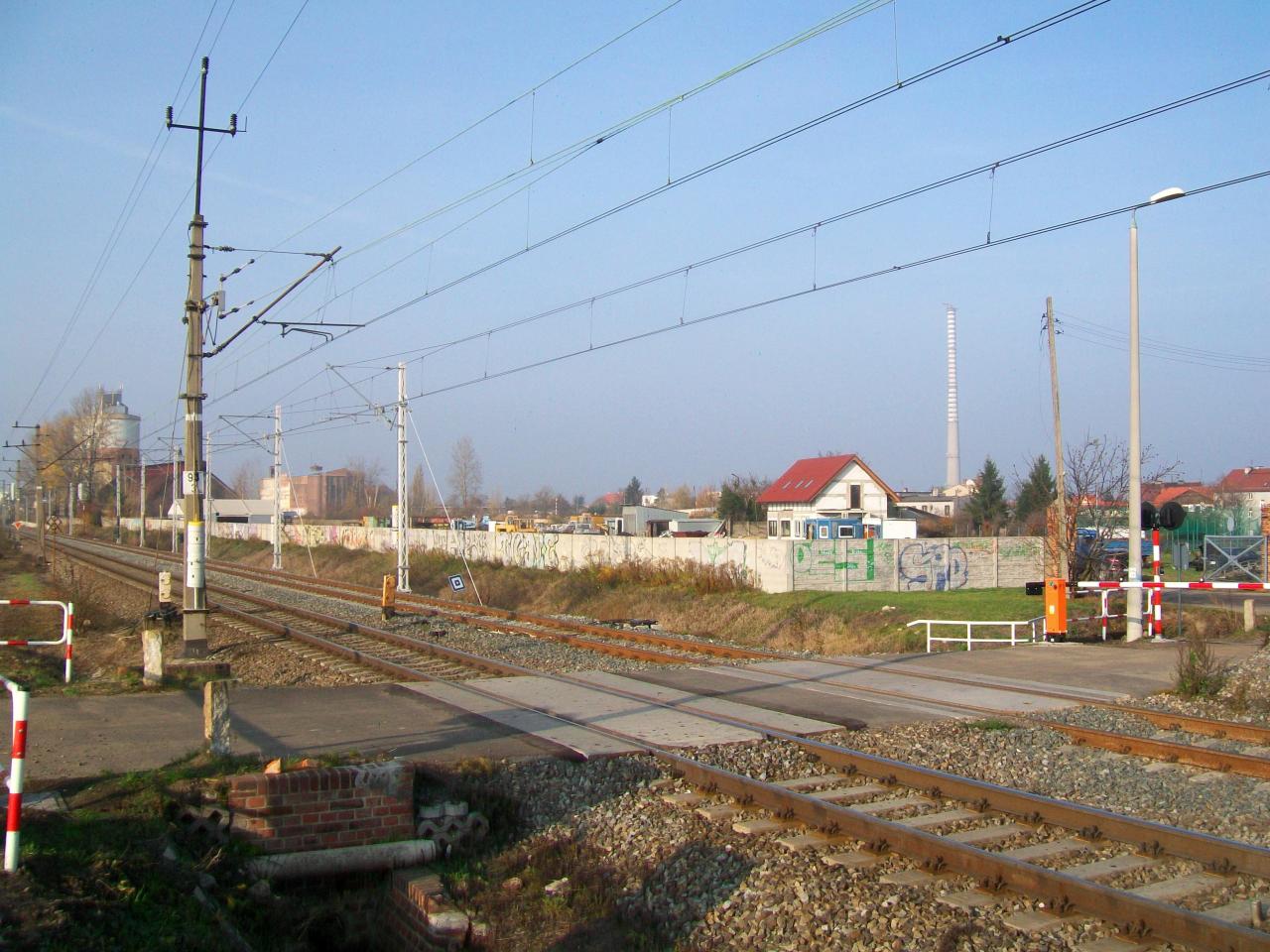 Przejazd kolejowy w północno-zachodniej głowicy. Na drugim planie rozpoczynała się niegdyś Cukrownia "Głogów". W tle stoi wysoki komin - pamiątka po nigdy nieuruchomionej elektrociepłowni na Widziszowie. Widok w kierunku północnym (w lewo stacja Głogów, w prawo peron).