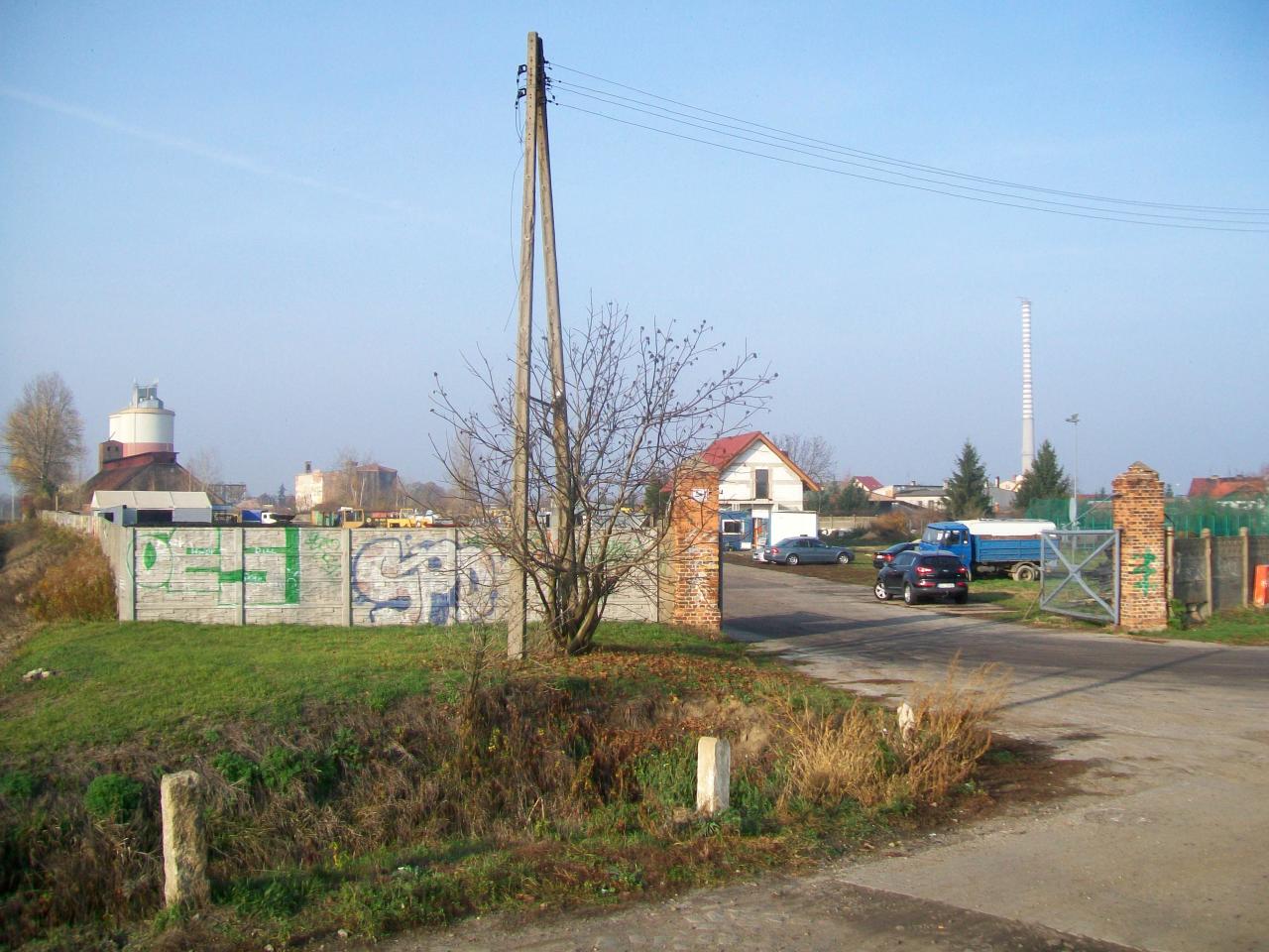 Dawna brama wjazdowa na teren zlikwidowanej Cukrowni "Głogów". W tle stoi wysoki komin - pamiątka po nigdy nieuruchomionej elektrociepłowni na Widziszowie. Północno-zachodnia głowica stacyjna (za plecami przejazd kolejowy).