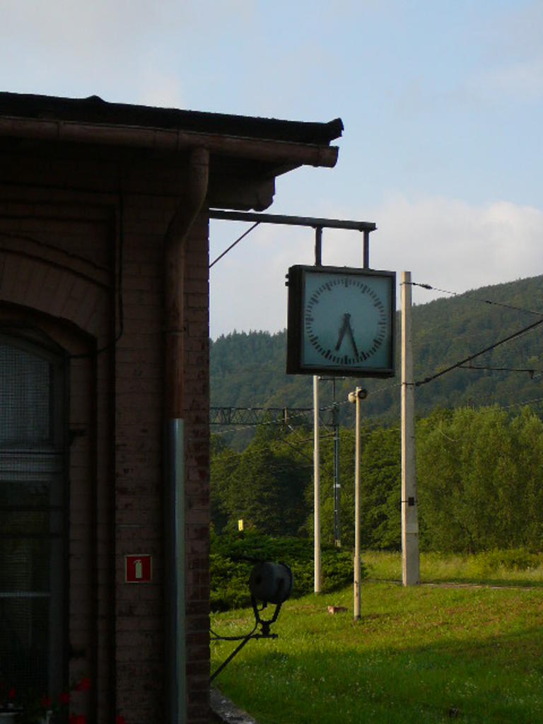 Gorzanów. Pierwszy zegar na budynku dworca i widok w stronę Kłodzka.