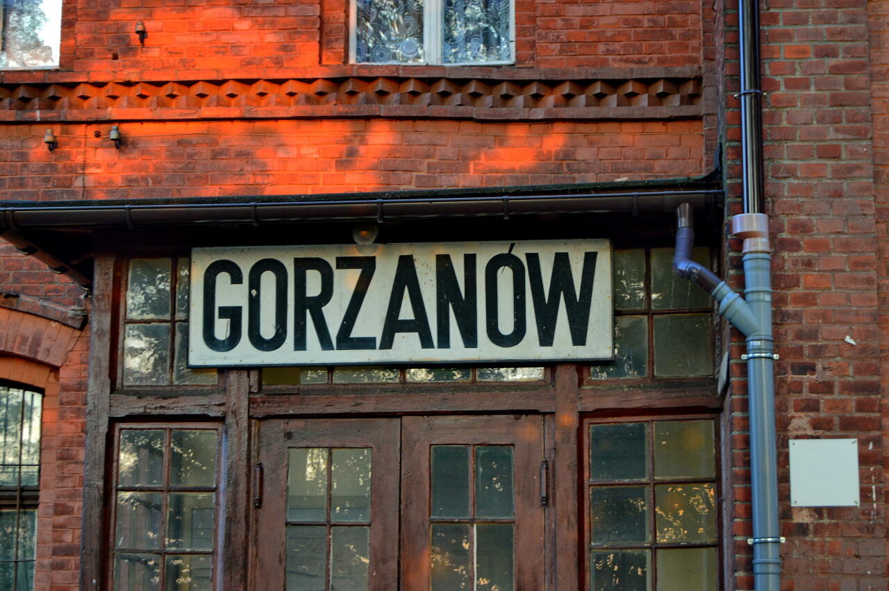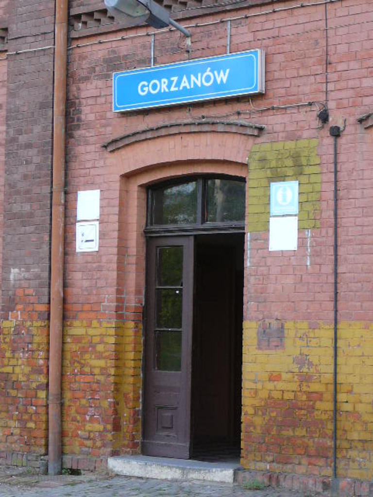 Gorzanów. Tablica z nazwą stacji na budynku dworca.