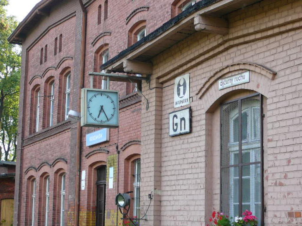 Gorzanów. Fragment budynku dworca od strony torów z zegarem. W budynku mieści się nastawnia dysponująca (z prawej).