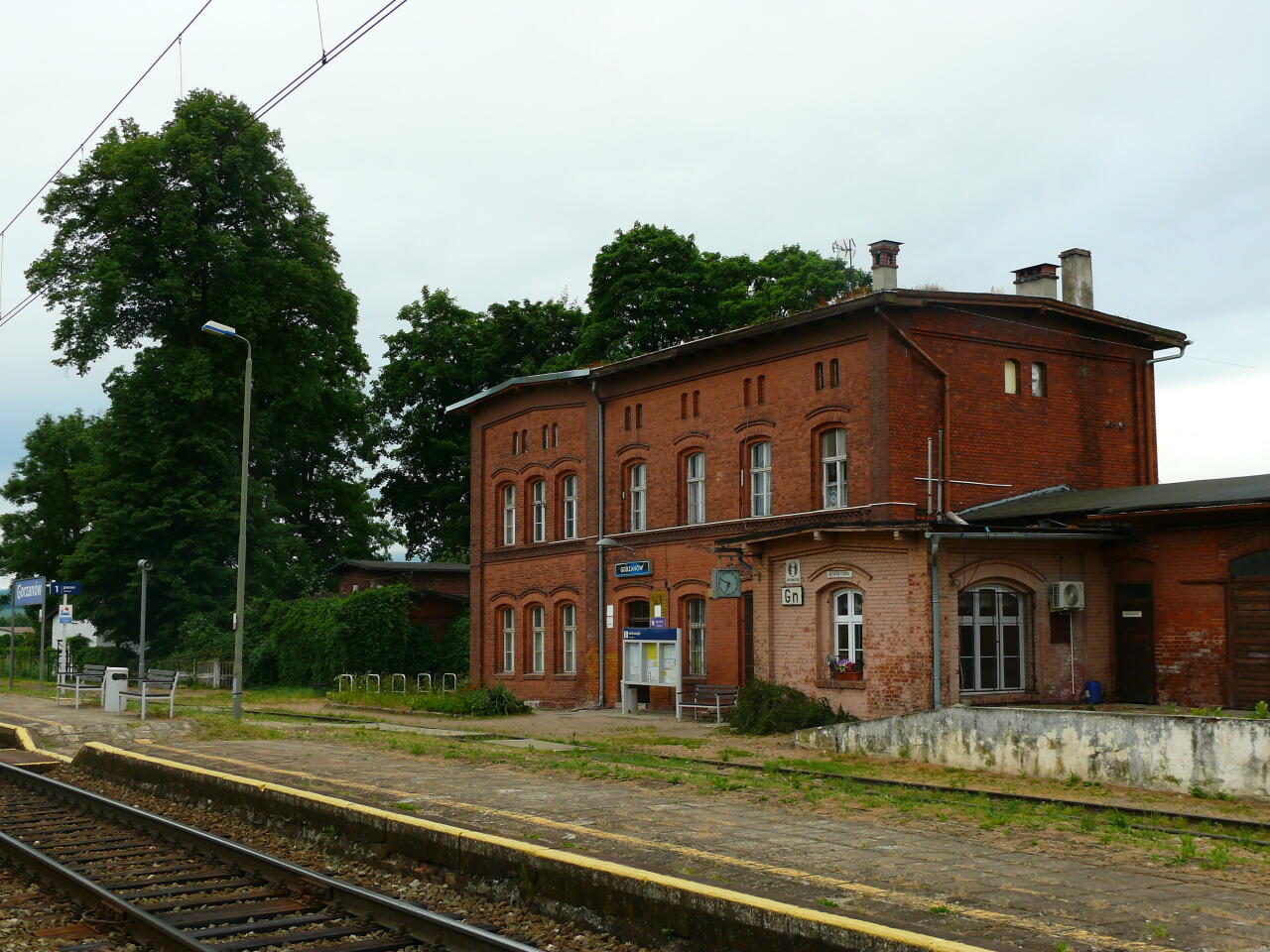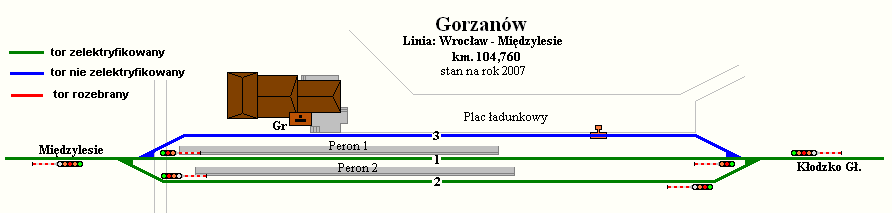 Dworzec w Gorzanowie widziany od strony torów. W budynku mieści się nastawnia dysponująca. Widok w kierunku wschodnim; w prawo Kłodzko, w lewo Bystrzyca Kłodzka/Międzylesie.