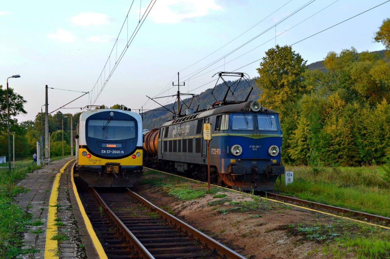 Gorzanów. Widok z peronu 1 w kierunku Kłodzka. Przy peronie 1 EN57-2040 jako R Międzylesie - Leszno, tuż obok przy peronie 2 ET22-931 oczekujący wolnej drogi w kierunku Bystrzycy Kłodzkiej/Międzylesia.
