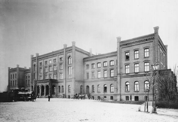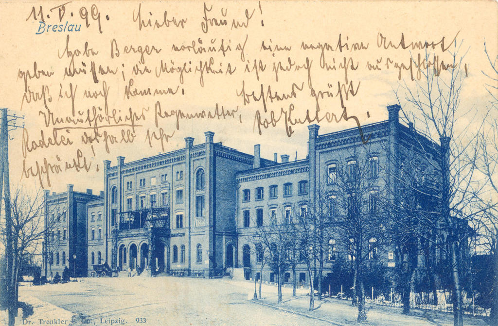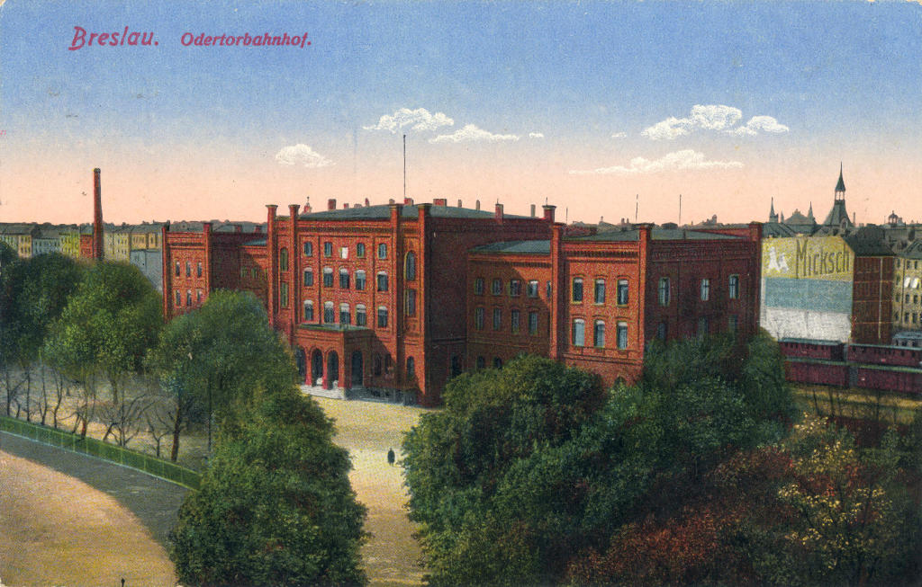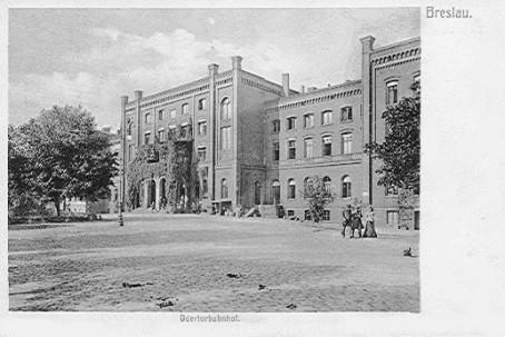 Stacja Wrocław Nadodrze, widok na budynek dworcowy od strony miasta. Z prawej strony magazyn towarowy, pod który jeszcze przez II wojną światową podjeżdżały do widocznej rampy bocznej wrocławskiej tramwaje towarowe.