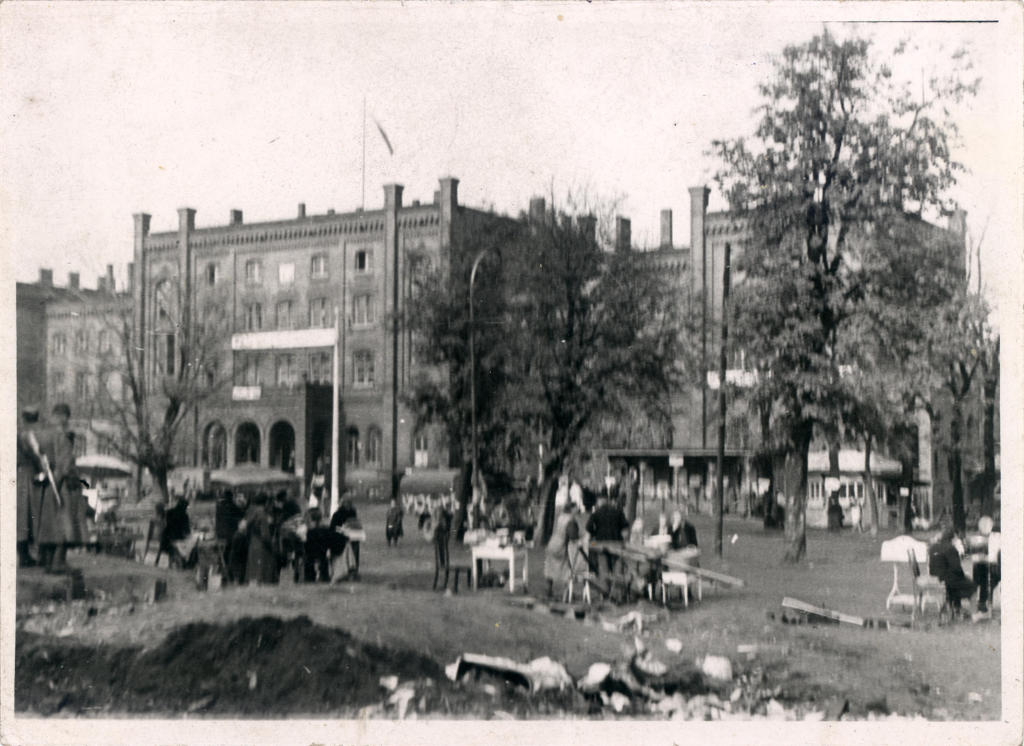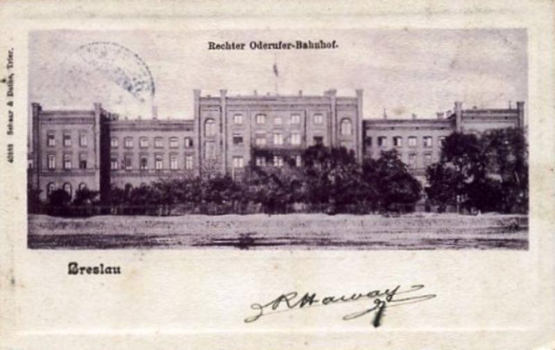Budynek dworca i plac przydworcowy tuż po kapitulacji Festung Brelasu widziany w kierunku północno-zachodnim. Ze zbiorów Adama Pacześniaka.